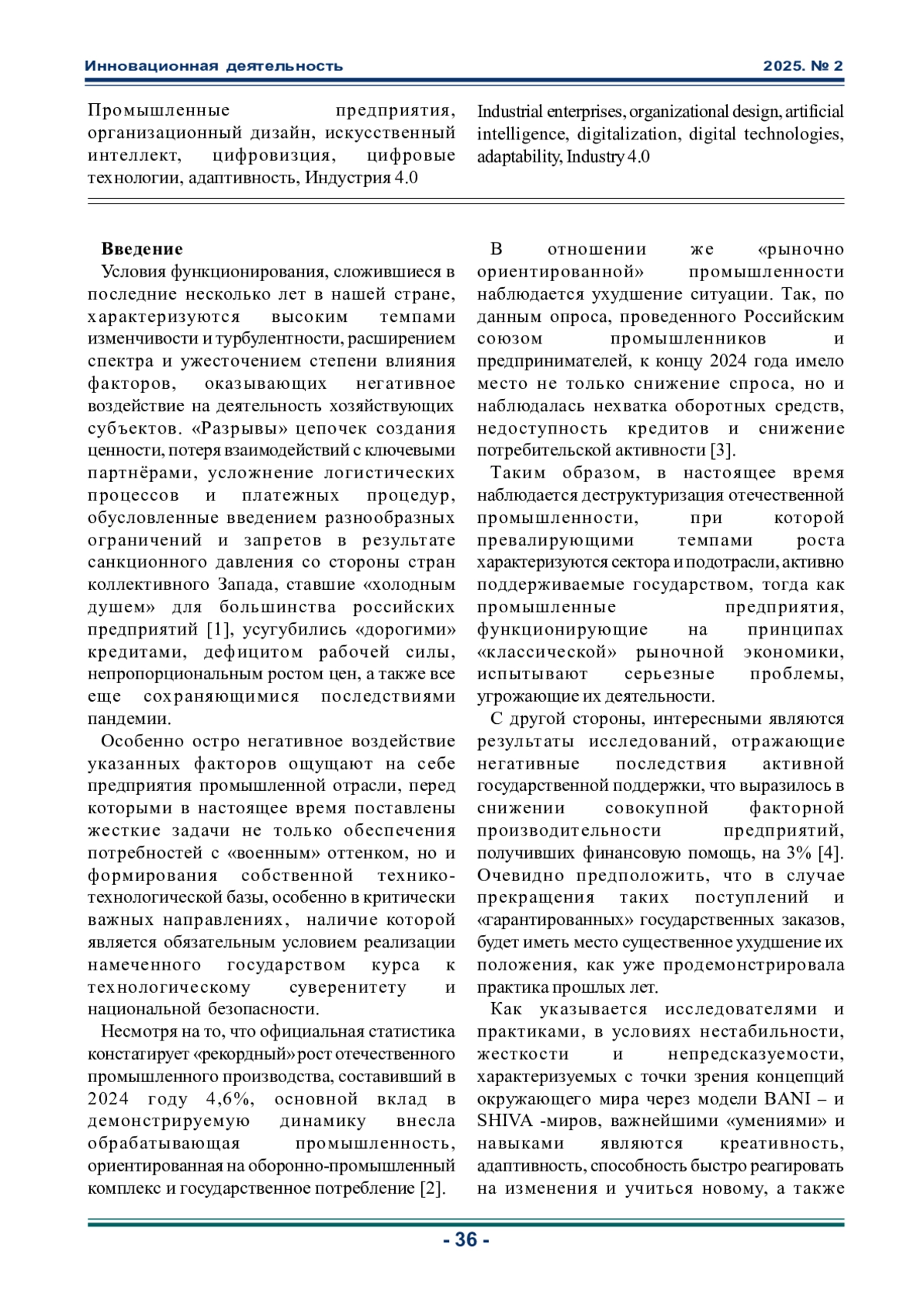 Ключевые фразы: промышленные предприятия, ОРГАНИЗАЦИОННЫЙ ДИЗАЙН, искусственный интеллект, цифровизция, цифровые технологии, адаптивность, индустрия 40