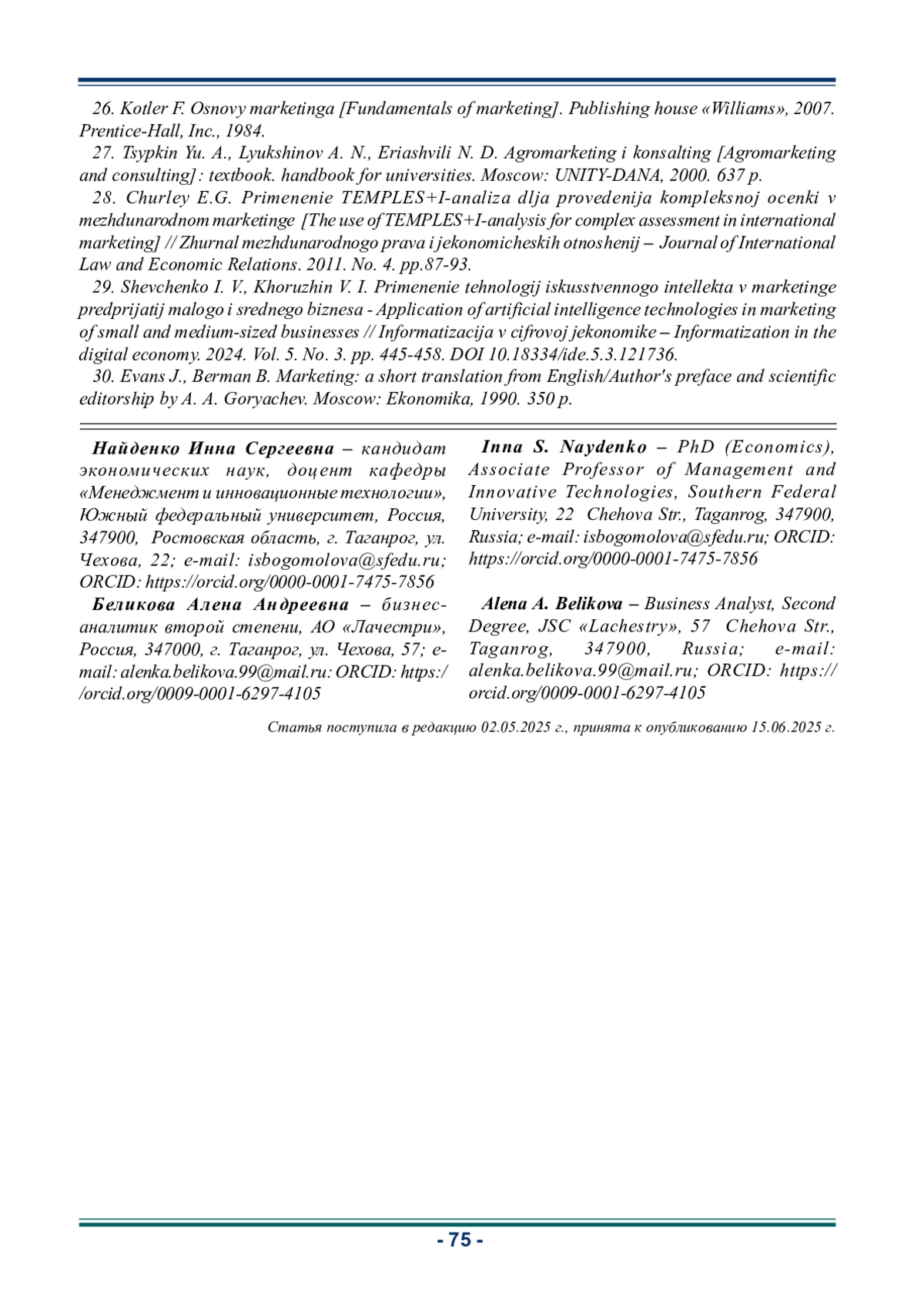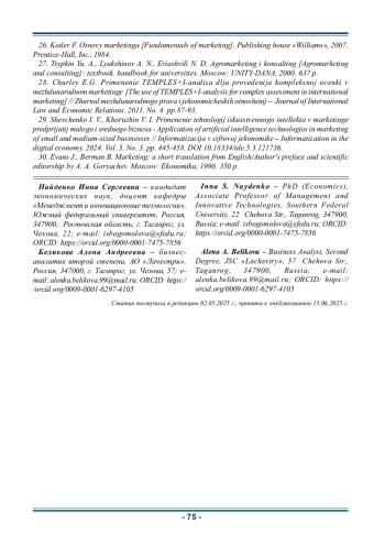 29. Шевченко И. В., Хоружин В. И. Применение технологий искусственного интеллекта в маркетинге предприятий малого и среднего бизнеса // Информатизация в цифровой экономике. 2024. Т. 5. № 3. С. 445-458. DOI: 10.18334/ide.5.3.121736 EDN: ZPPLEE
