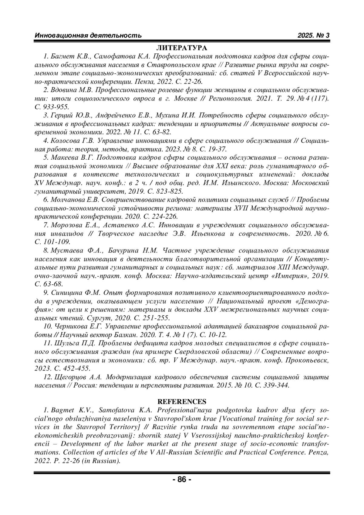 1. Багмет К.В., Самофатова К.А. Профессиональная подготовка кадров для сферы социального обслуживания населения в Ставропольском крае // Развитие рынка труда на современном этапе социально-экономических преобразований: сб. статей V Всероссийской научно-практической конференции. Пенза, 2022. С. 22-26.