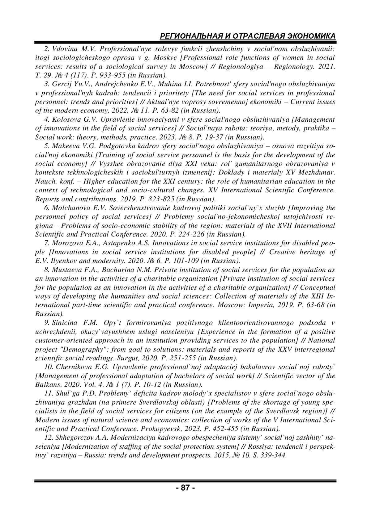 3. Герций Ю.В., Андрейченко Е.В., Мухина И.И. Потребность сферы социального обслуживания в профессиональных кадрах: тенденции и приоритеты // Актуальные вопросы современной экономики. 2022. № 11. С. 63-82.