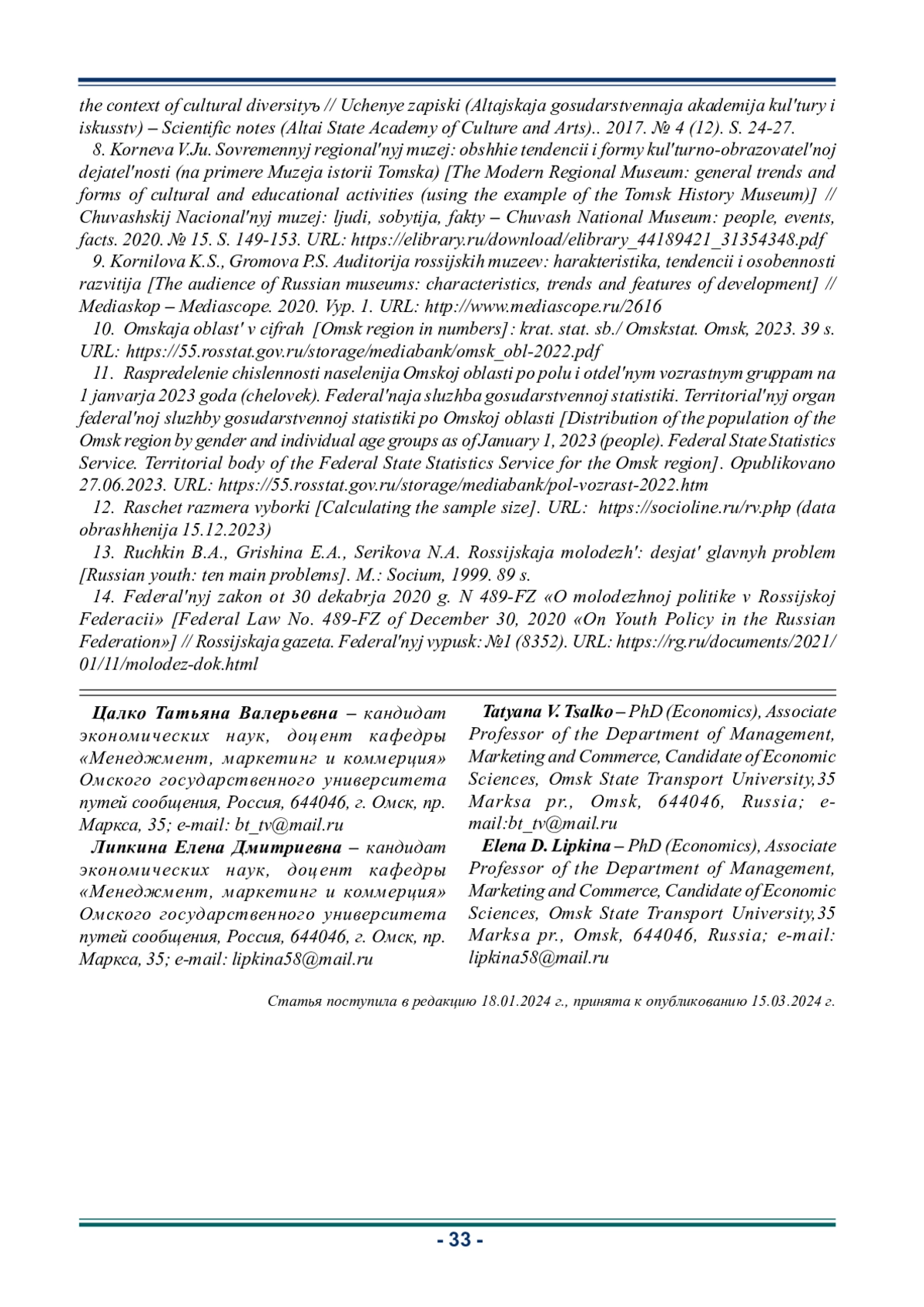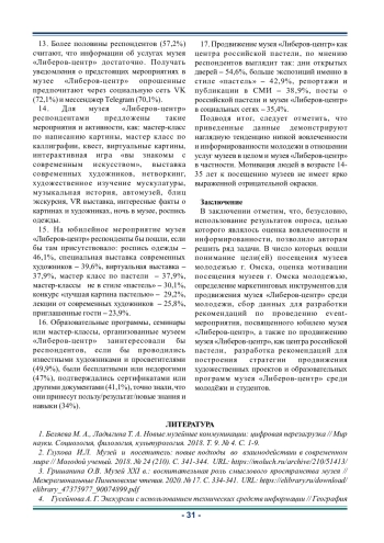 9. Корнилова К.С., Громова П.С. Аудитория российских музеев: характеристика, тенденции и особенности развития // Медиаскоп. 2020. Вып. 1. URL: http://www.mediascope.ru/2616. EDN: KTGKSQ