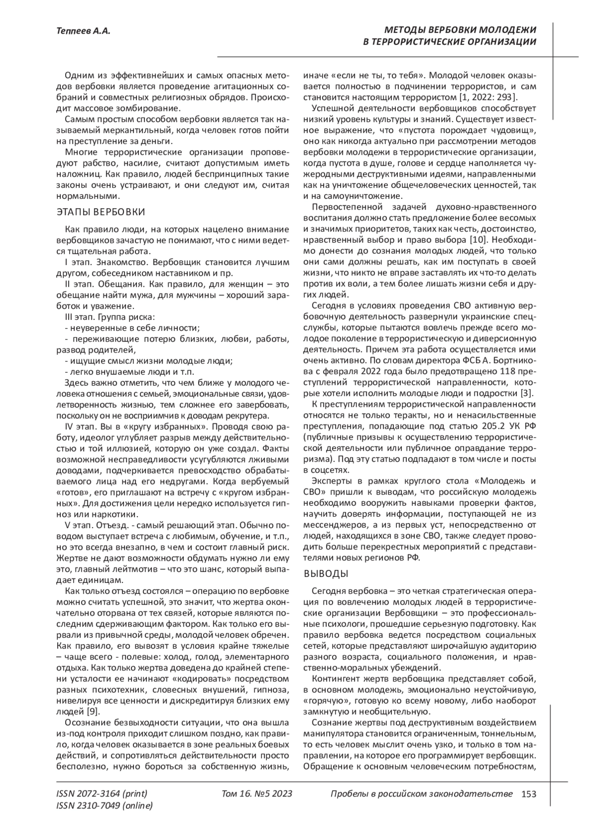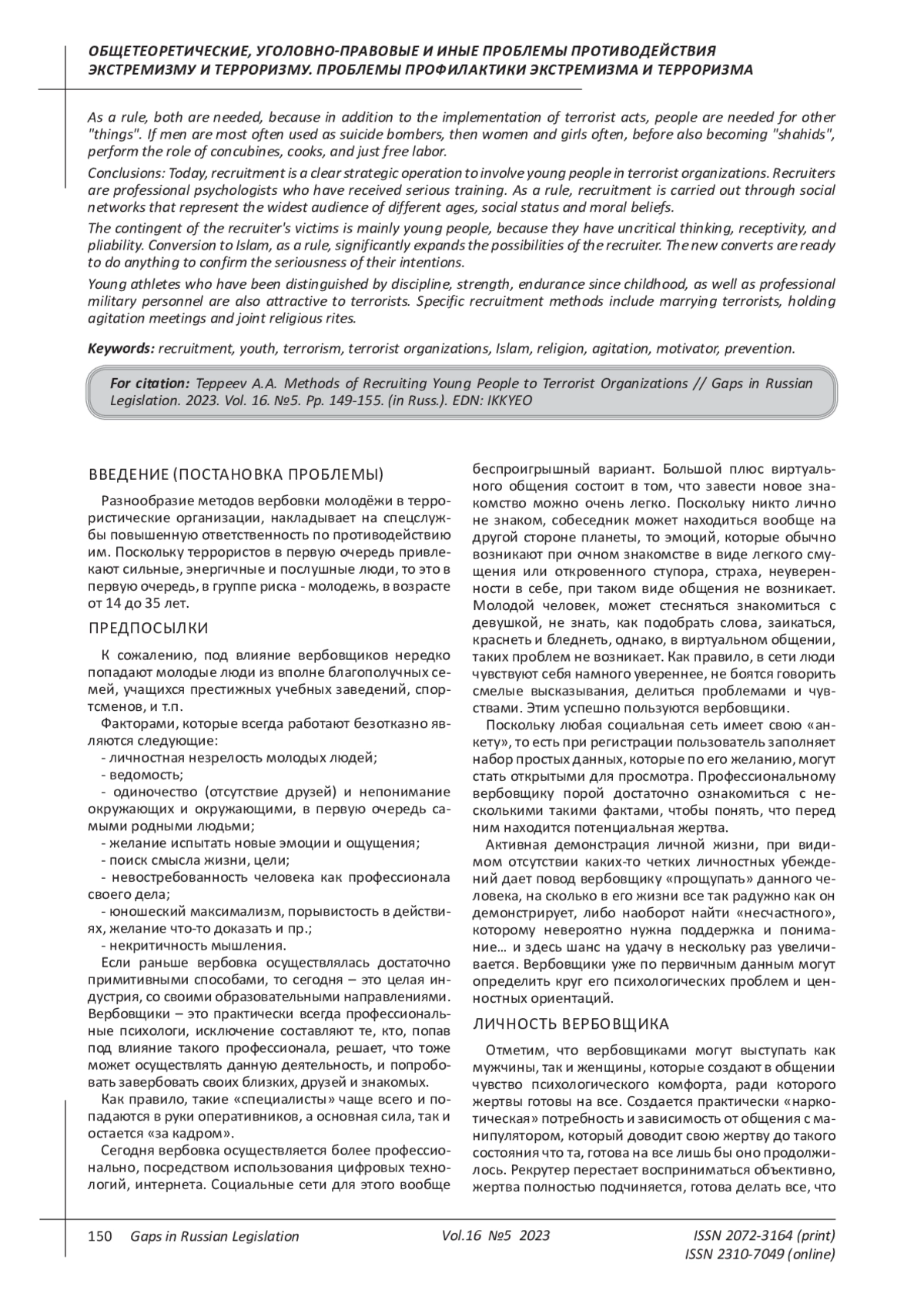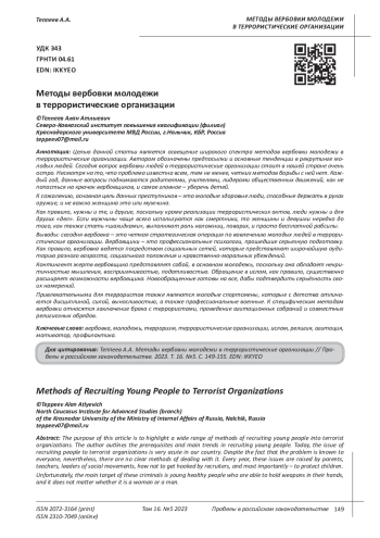 Целью данной статьи является освещение широкого спектра методов вербовки молодежи в террористические организации. Автором обозначены предпосылки и основные тенденции в рекрутинге молодых людей. Сегодня вопрос вербовки людей в террористические организации стоит в нашей стране очень остро. Несмотря на то, что проблема известна всем, тем не менее, четких методов борьбы с ней нет. Каждый год, данные вопросы поднимаются родителями, учителями, лидерами общественных движений, как не попасться на крючок вербовщиков, и самое главное - уберечь детей. К сожалению, основная цель данных преступников - это молодые здоровые люди, способные держать в руках оружие, и не важно женщина это или мужчина. Как правило, нужны и те, и другие, поскольку кроме реализации террористических актов, люди нужны и для других «дел». Если мужчины чаще всего используются как смертники, то женщины и девушки нередко до того, как также стать «шахидками», выполняют роль наложниц, поварих, и просто бесплатной рабсилы. Выводы: сегодня вербовка - это четкая стратегическая операция по вовлечению молодых людей в террористические организации. Вербовщики - это профессиональные психологи, прошедшие серьезную подготовку. Как правило, вербовка ведется посредством социальных сетей, которые представляют широчайшую аудиторию разного возраста, социального положения и нравственно-моральных убеждений. Контингент жертв вербовщика представляет собой, в основном молодежь, поскольку она обладает некритичностью мышления, восприимчивостью, податливостью. Обращение в ислам, как правило, существенно расширяет возможности вербовщика. Новообращенные готовы на все, дабы подтвердить серьёзность своих намерений. Привлекательными для террористов также являются молодые спортсмены, которые с детства отличаются дисциплиной, силой, выносливостью, а также профессиональные военные. К специфическим методам вербовки относятся заключение брака с террористами, проведение агитационных собраний и совместных религиозных обрядов.