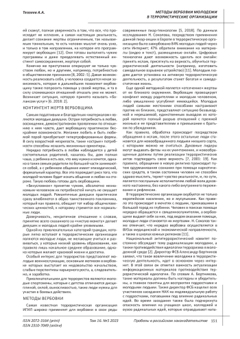 Kalinina S.B. Psychological methods of recruiting youth into terrorist organizations // Nauka. Society. Defense. 2018. - No. 2 (15). - P. 1-5.