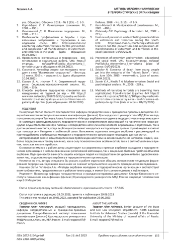 1. Ананьин О.Ю., Базулина А.А., Жуланов А.А. Вербовка молодежи в террористические организации посредством социальных сетей: проблемы профилактики // Вестник экономической безопасности. 2022. - №5. - С.290-295. EDN: LUOIDB