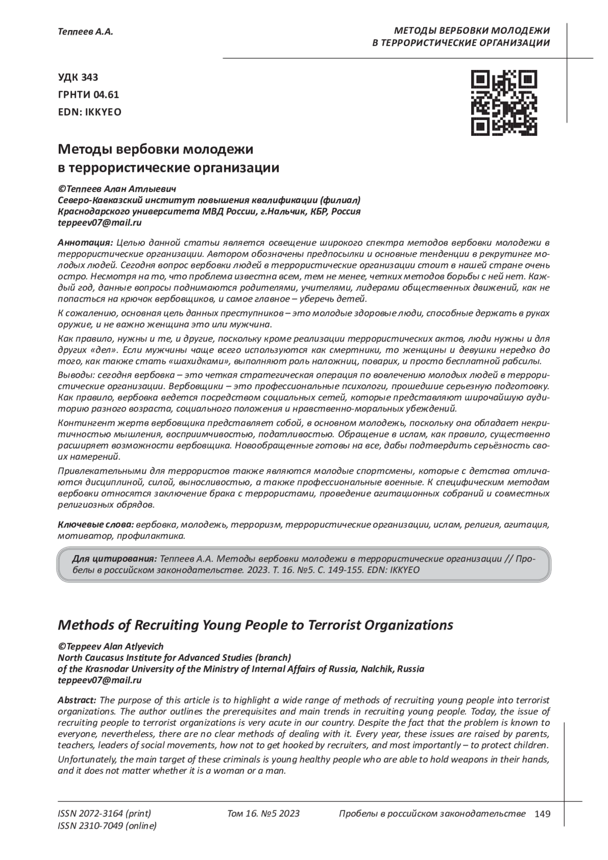 Kalinina S. Recruitment of youth in terrorist organizations Nauka. Society. Defense (noo-journal.ru). - 2018. - No. 2 (15) https://www.noo-journal.ru/nauka-obshestvo-oborona/2018-2-15/article-0145/ (date of access: 04/20/2022).