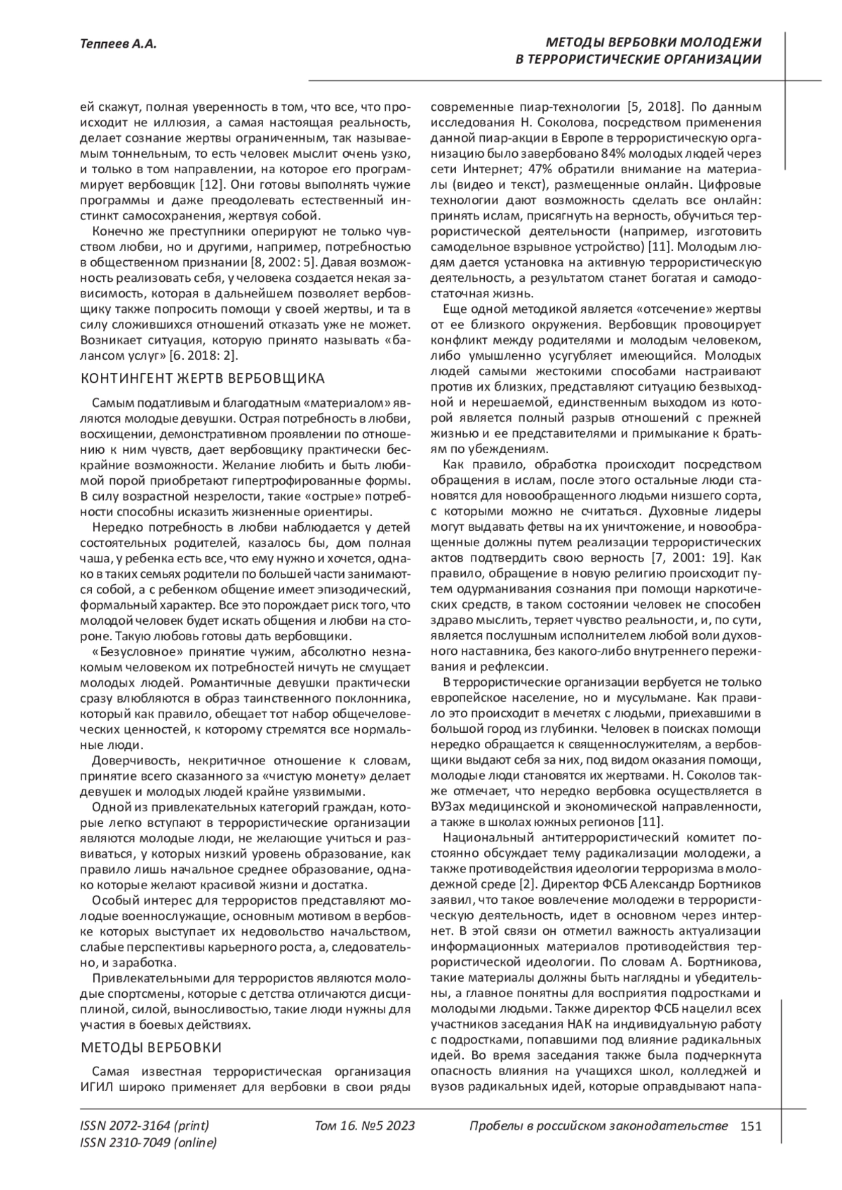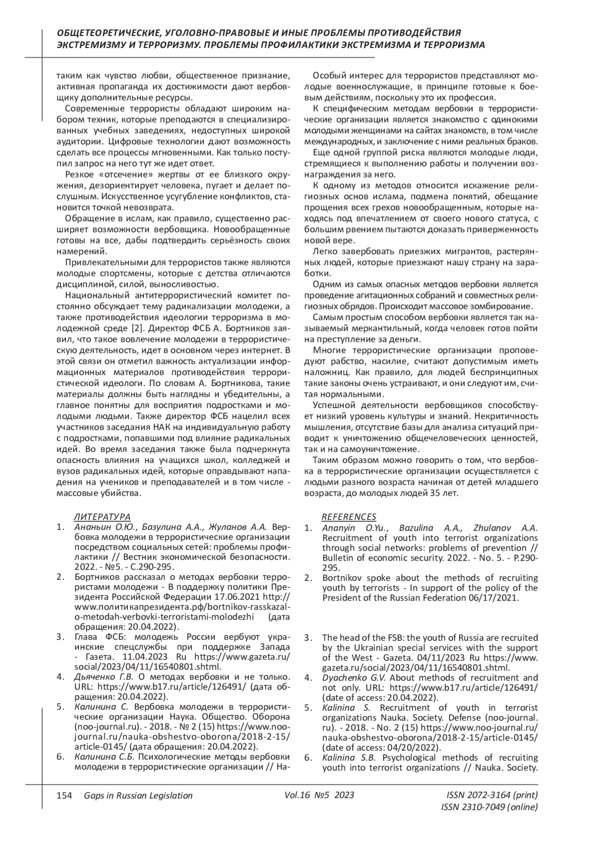 6. Калинина С.Б. Психологические методы вербовки молодежи в террористические организации // Наука. Общество. Оборона. 2018. - № 2 (15). - С. 1-5. EDN: YKZYNV