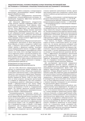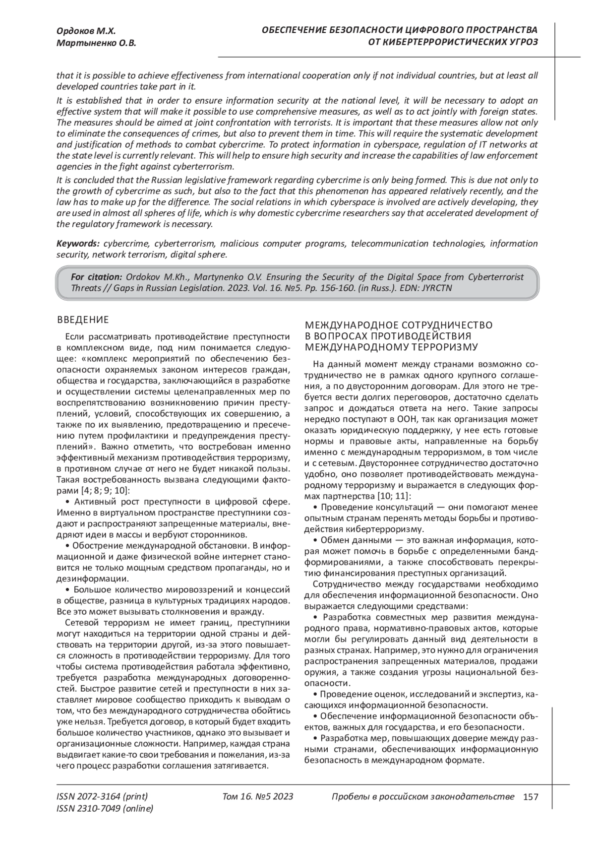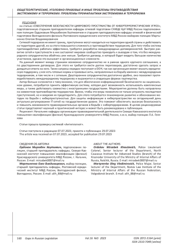 Zhukov A.Z. Improvement of tools for countering cyberterrorism in modern conditions // Gaps in Russian legislation. 2021. Vol. 14. No. 5. pp. 123-128.