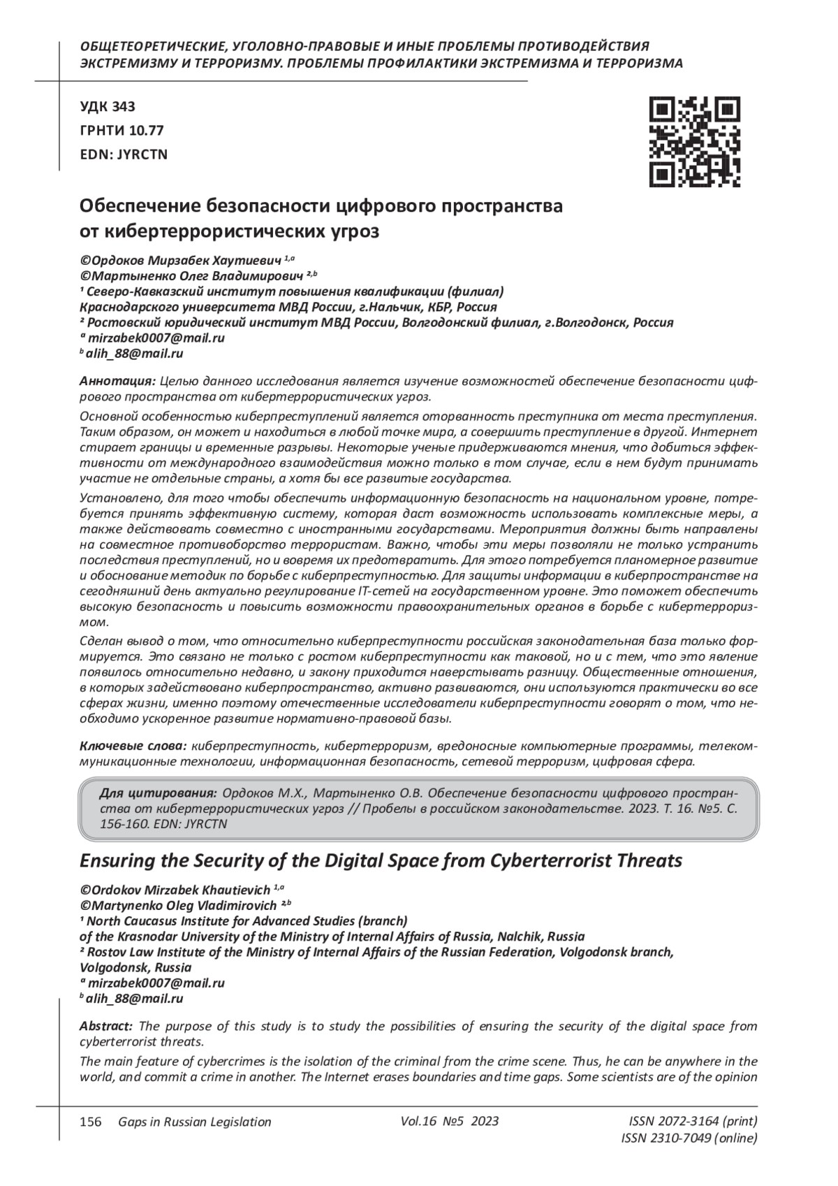 Phitikov R.B. The development of cyberterrorism in the global information space // Law and Management. 2023. No. 2. pp. 151-154.