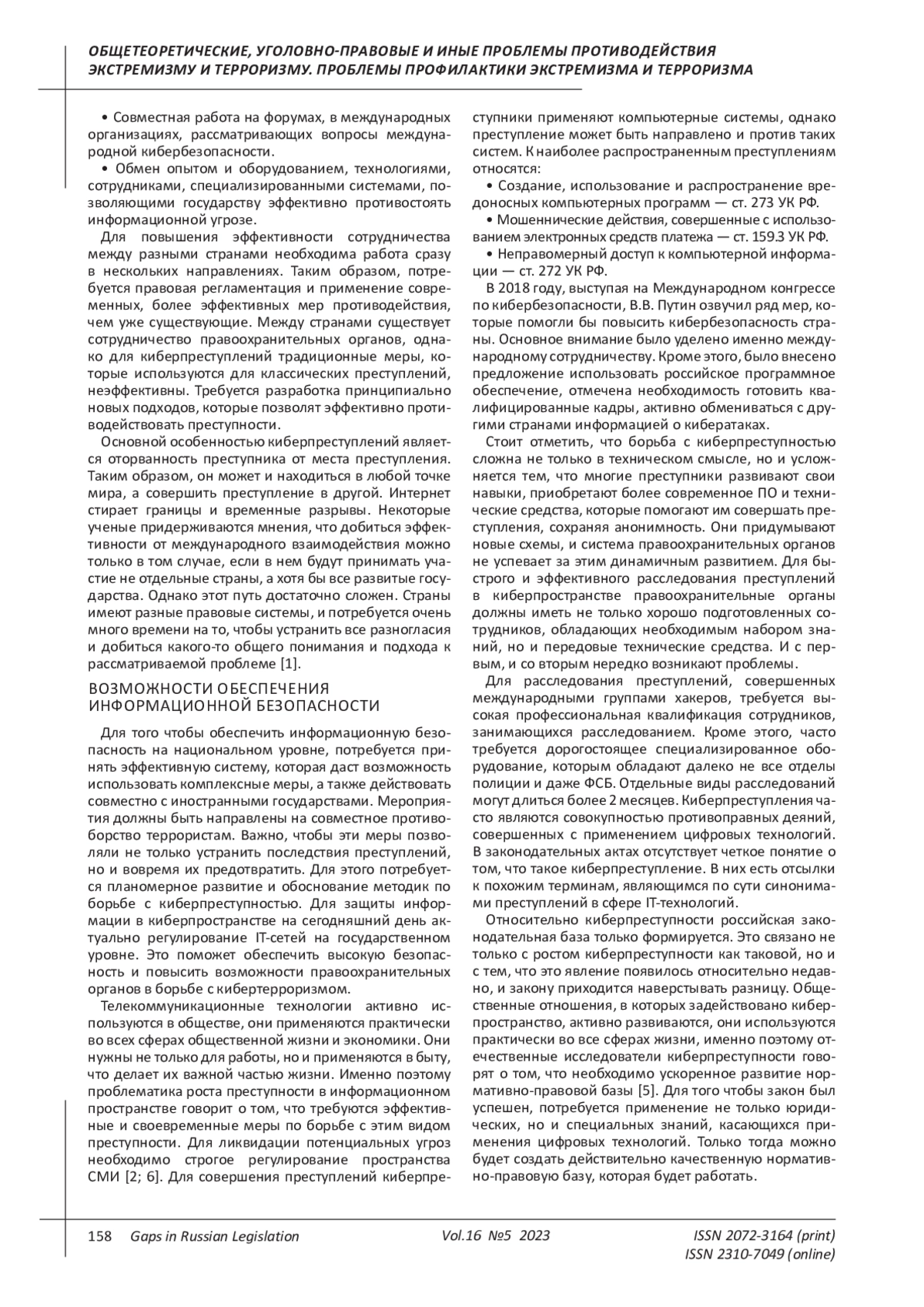 5. Пхитиков Р.Б. Развитие кибертерроризма в глобальном информационном пространстве // Право и управление. 2023. № 2. С. 151-154. EDN: SKQTAE