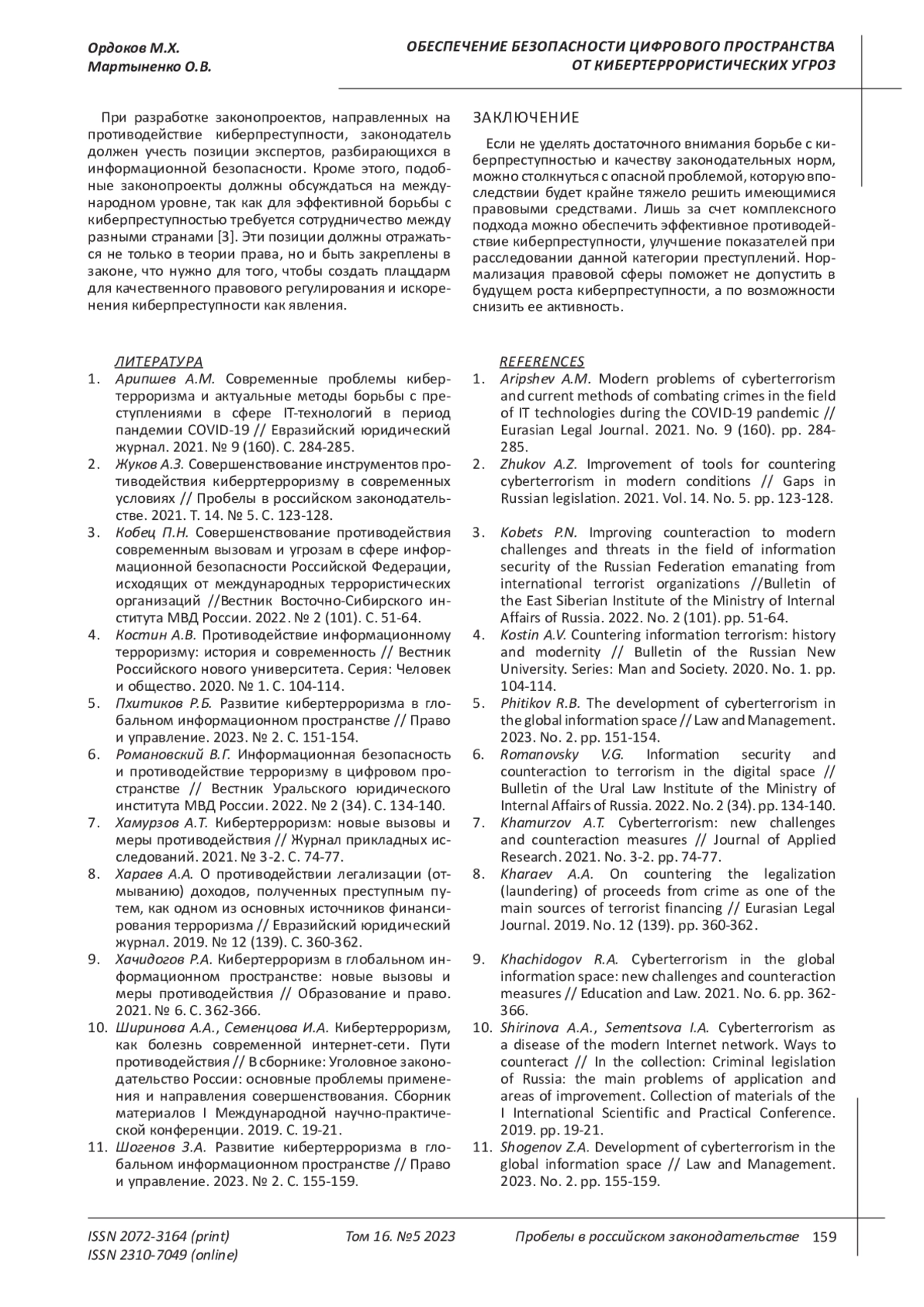 1. Арипшев А.М. Современные проблемы кибертерроризма и актуальные методы борьбы с преступлениями в сфере IT-технологий в период пандемии COVID-19 // Евразийский юридический журнал. 2021. № 9 (160). С. 284-285. EDN: PGNLYZ