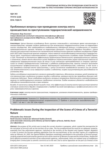 Целью данного исследование было изучение сложившейся в настоящее время конъюнктуры в геопространстве, которая создала предпосылки для активизации террористических ячеек на территории нашего государства. Это предопределило необходимость адекватной реакции в особенности со стороны правоохранительных органов. Начатая на территории Донецкой и Луганской Народных Республик с целью защиты русскоязычного населения от посягательств неонацистского режима соседнего государства 24 февраля 2022 года Специальная военная операция, стала невольно поспособствовала активизации террористических групп, тщательно подготавливаемых и курируемых специальными службами стран Западной Европы и США. Несмотря на достаточно эффективную превентивную деятельность правоохранительных органов, к сожалению, имеют место единичные случаи доведения злоумышленниками своего преступного замысла по совершению террористического акции до конца. В силу активного противодействия со стороны преступников на стадии предварительного следствия и судебного разбирательства, важное значение принимает осуществление профессионального, в рамках действующего законодательства, следствия, в том числе и при проведении осмотра места происшествия, с целью исключения освобождения виновных лиц от уголовной ответственности в силу совершения ошибок и недочетов, лицами осуществляющими расследование по уголовному делу. Задачи исследования заключаются в анализе имеющейся практики, обозначении основных целей осмотра места происшествия и выделении основных ошибок и недочетов, имеющих место при проведении данного следственного действия. Также необходимо выделить основные направления деятельности соответствующих органов по предотвращению указанных проблемных аспектов. Особое внимание уделяется необходимости соблюдения законодательства и прав человека. Выводы: В заключении автор делает вывод о том, что эффективный осмотр места происшествия является ключевым элементом в борьбе с терроризмом и требует высокой квалификации и профессионализма со стороны правоохранительных органов.