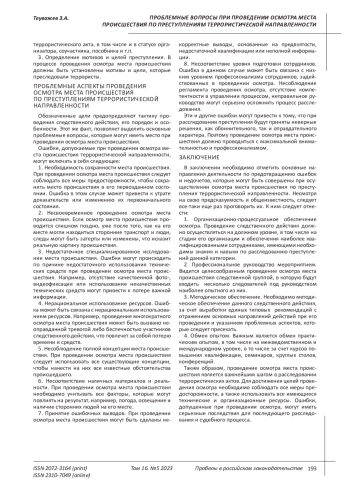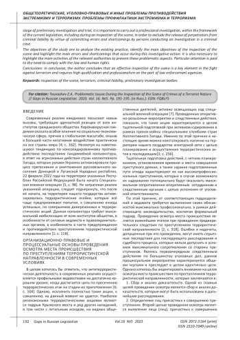 По этой причине, от соответствующих подразделений и ведомств требуется выполнение своих обязанностей максимально профессионально, в рамках действующего законодательства, исключая формальный подход. Проведение осмотра места происшествия является важнейшим этапом при проведении предварительного следствия по преступлениям террористической направленности [2; с. 318]. Ошибки и недочеты, допущенные при его проведении, могут иметь серьезные последствия для последующего расследования и судебного процесса, которые нельзя допускать в условиях максимального сопротивления со стороны преступников.