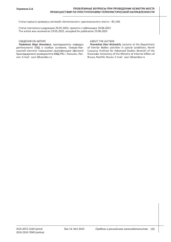 Mashekuasheva M.Kh., Kochesokova Z.Kh. Some issues of improving the activities of the Department of Internal Affairs in the fight against terrorism and hostage-taking // Education and Law. 2022. No. 4. P. 317-319. EDN: RKMYKF