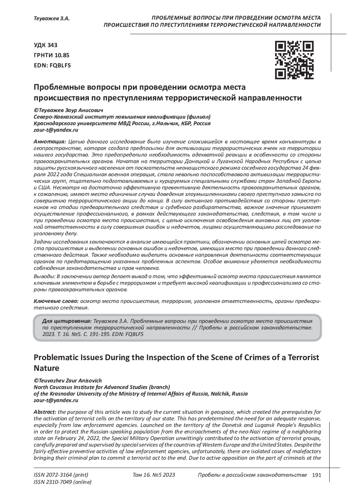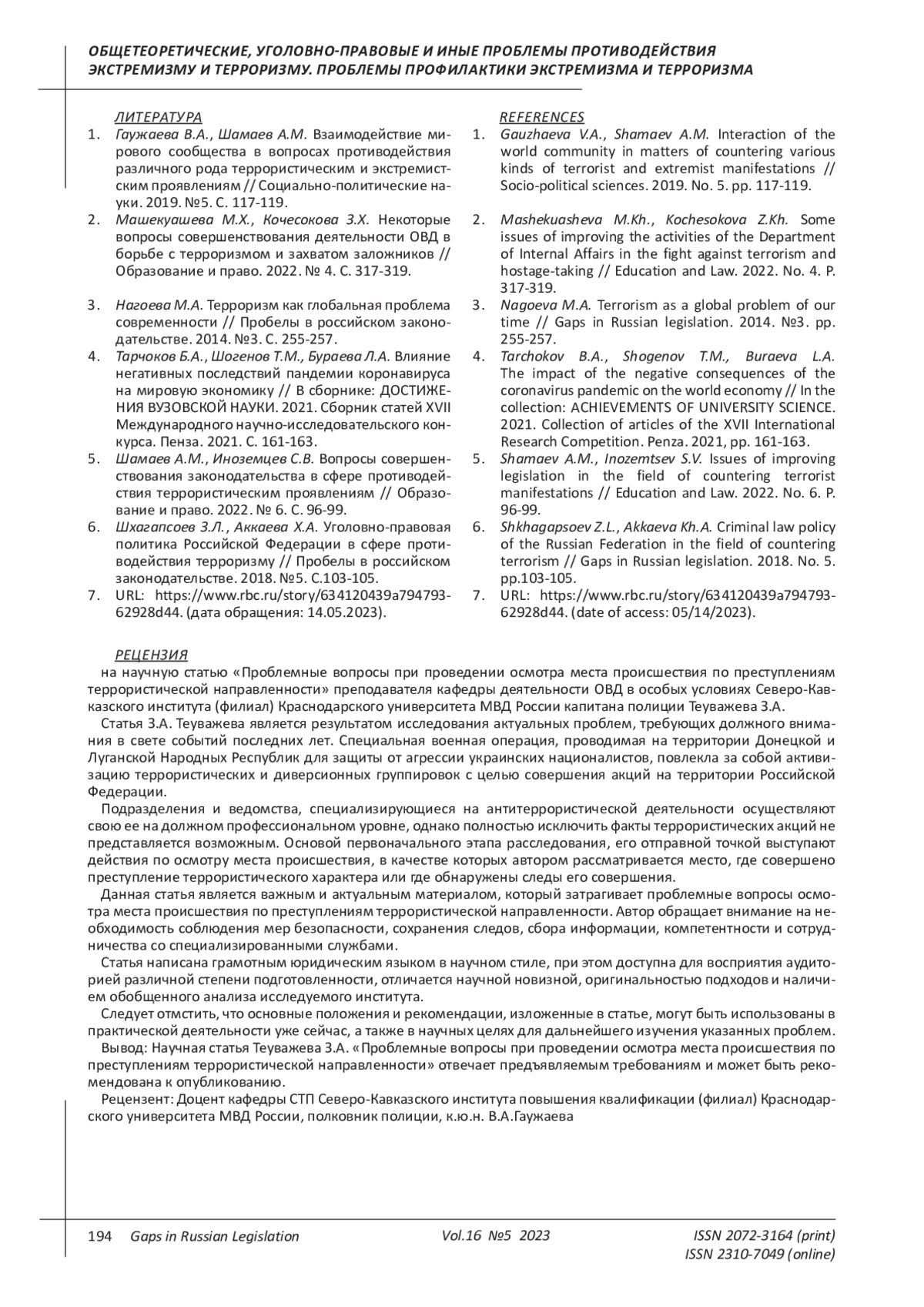 6. Шхагапсоев З.Л., Аккаева Х.А. Уголовно-правовая политика Российской Федерации в сфере противодействия терроризму // Пробелы в российском законодательстве. 2018. №5. С.103-105. EDN: YCNBFR