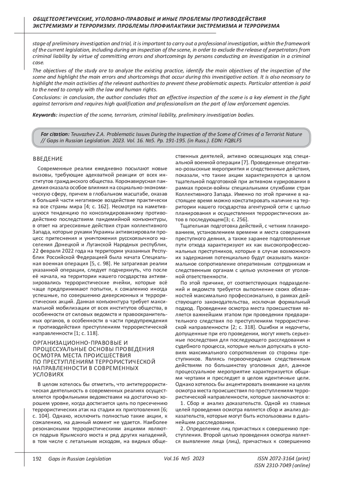 Современные международные отношения и специфика их развития оказывают существенное влияние на совершенствование противоправной практики и особое значение в данном контексте приобретает распространение экстремистских и террористических проявлений. Для российского государства в настоящее время актуальным представляется рассмотрение процесса развития экстремизма и терроризма в контексте обострения геополитического конфликта с Украиной и проведением специальной военной операции в Донбассе. Указанные процессы выступают закономерным результатом длительных напряженных межгосударственных отношений, которые оказывают серьезное влияние на мировосприятие российского населения, в том числе в части формирования преступной практики. Учитывая тот факт, что за последние годы существенно увеличилось количество экстремистских преступлений и предотвращено достаточно много террористических актов, возникают вопросы об эффективности современных механизмов борьбы с экстремизмом и терроризмом в Российской Федерации. Целью представленного исследования выступает анализ актуальных вопросов борьбы с экстремизмом и терроризмом в Российской Федерации с учетом современных международных и внутригосударственных политических реалий. Авторы приходят к выводу о том, что несмотря на пристальное внимание к вопросам антиэкстремистской и контртеррористической деятельности в Российской Федерации, далеко не всегда вышеназванное функционирование компетентных органов государственной власти и институтов гражданского общества учитывает актуальные тенденции развития соответствующих противоправных идей и взглядов в современных геополитических реалиях, а также возможности воздействия антироссийской пропаганды, которая в настоящее время осуществляется многими зарубежными странами, в том числе в рамках внешнего санкционного давления. Акцентируется внимание на отдельных факторах, способствующих развитию экстремистского и террористического поведения на территории российского государства. Отмечается необходимость совершенствования профилактико-предупредительной деятельности антиэкстремистской и контртеррористической направленности в части организации ее опережающего влияния на сознание населения в контексте международных и внутригосударственных процессов, происходящих в настоящее время.