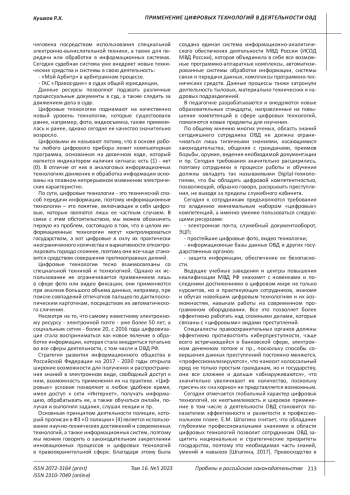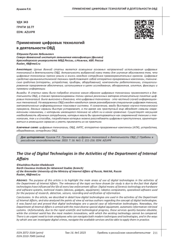 Целью данной статьи является освещение основных направлений использования цифровых технологий в деятельности ОВД. Актуальность выбранной нами темы для изучения обусловлена тем, что цифровые технологии прочно вошли в жизнь каждого сотрудника правоохранительных органов. Цифровые средства криминалистической техники представляют собой аппаратно-программные комплексы, технические средства (аппараты, устройства, приборы, оборудование), компоненты робототехники, специализированное программное обеспечение, используемые в целях исследования, обнаружения, изъятия, фиксации и проверки информации. Выводы: В статье нами было подробно описано каким образом цифровые технологии применяются в деятельности ОВД, а также проанализированы точки зрения различных авторов относительно понятия цифровых технологий. Было выяснено и доказано, что цифровые технологии - это частный случай информационных технологий. На вооружении ОВД сегодня находится самая разнообразная специальная цифровая техника, автоматические информационные поисковые системы. К сожалению, ввиду быстрого научно-технического прогресса, данные сервисы быстро устаревают, в то время как преступный мир обладает самыми современными новинками, с которыми имеющаяся техника не идет ни в какое сравнение. Существует насущная необходимость обучения сотрудников, которые могли бы ориентироваться как современной технике и технологиях, так и в способах, посредством которых можно расследовать цифровые преступления, ориентироваться в имеющихся сервисах и уметь применять их на практике.