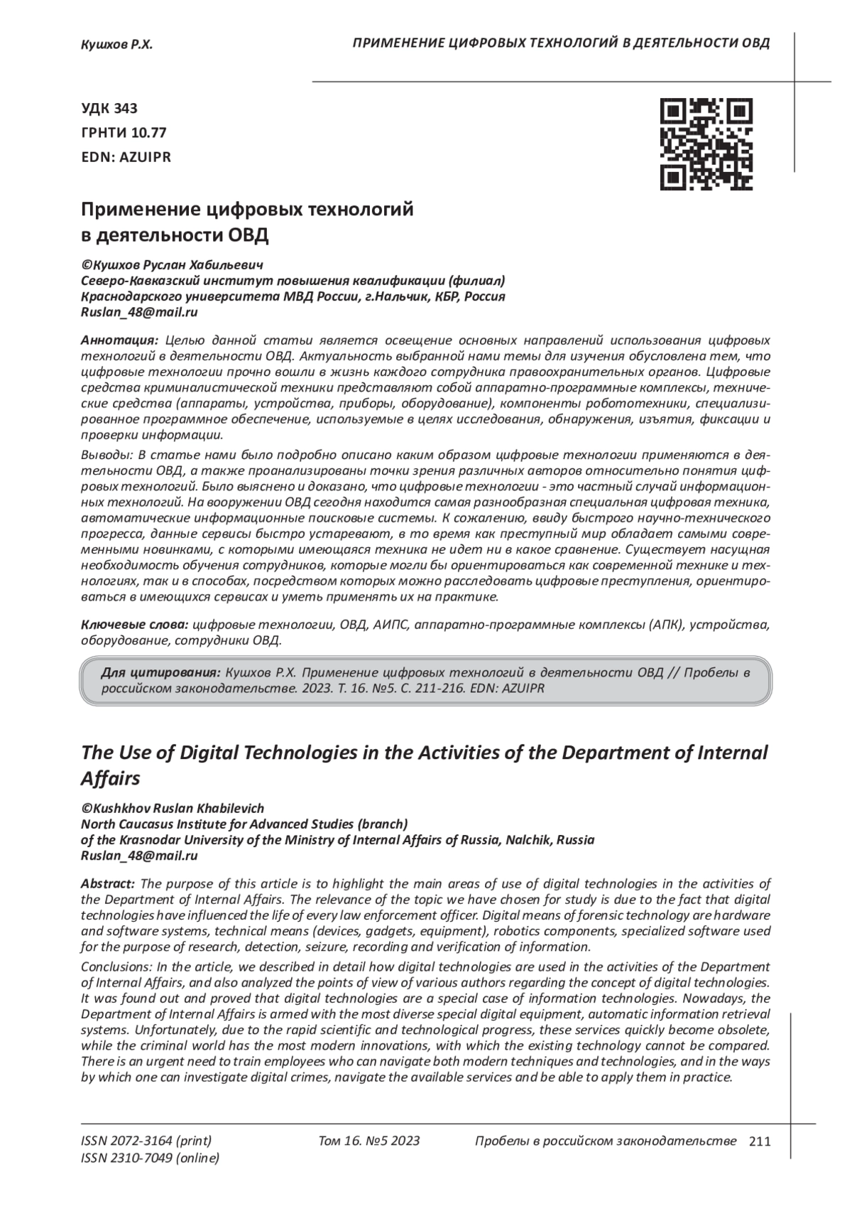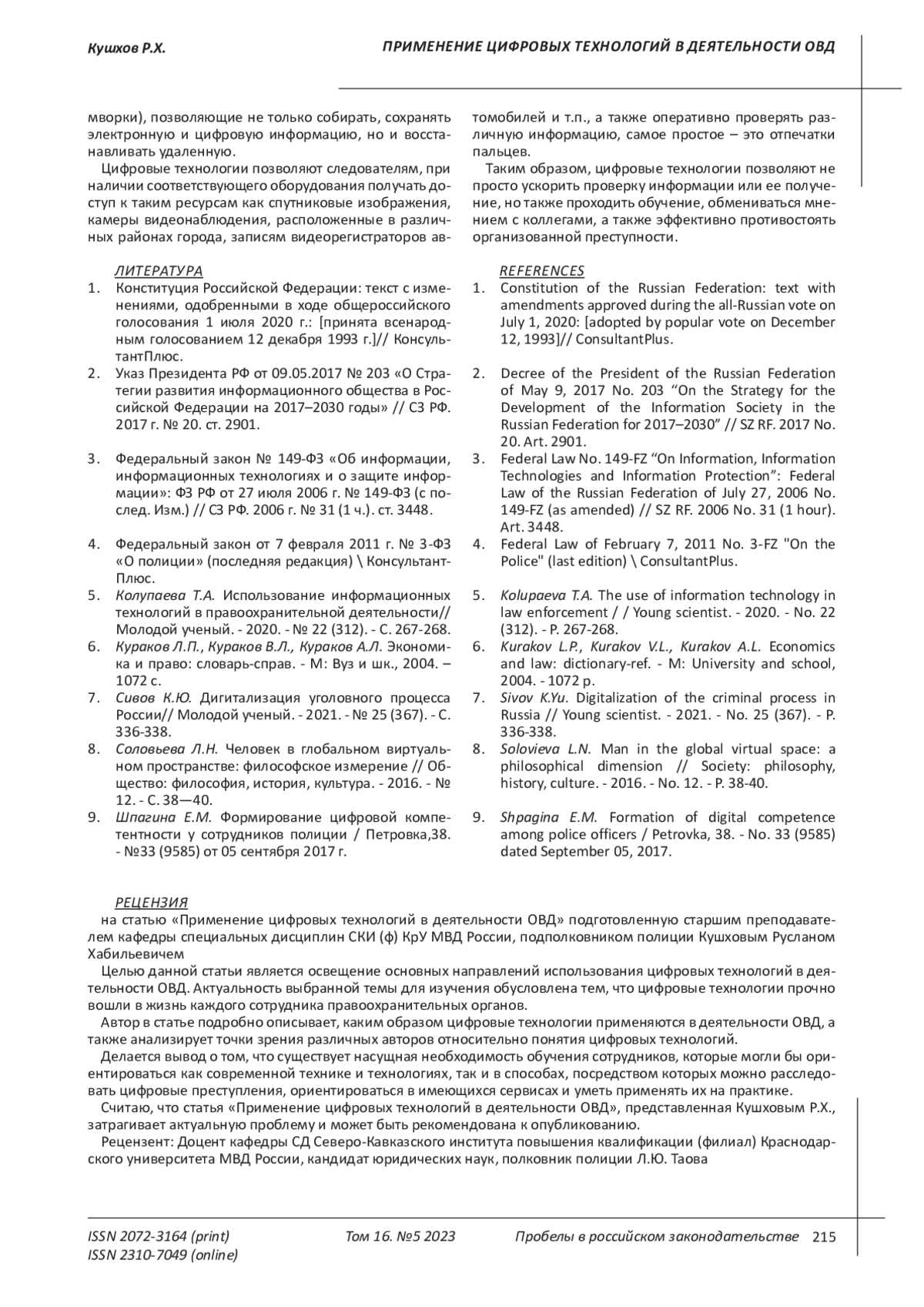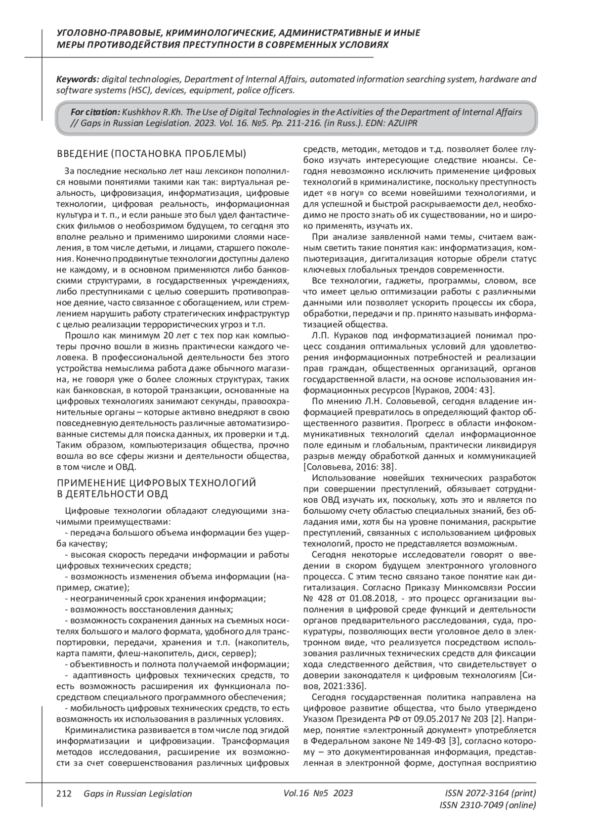 7. Сивов К.Ю. Дигитализация уголовного процесса России// Молодой ученый. - 2021. - № 25 (367). - С. 336-338. EDN: HBJKXZ