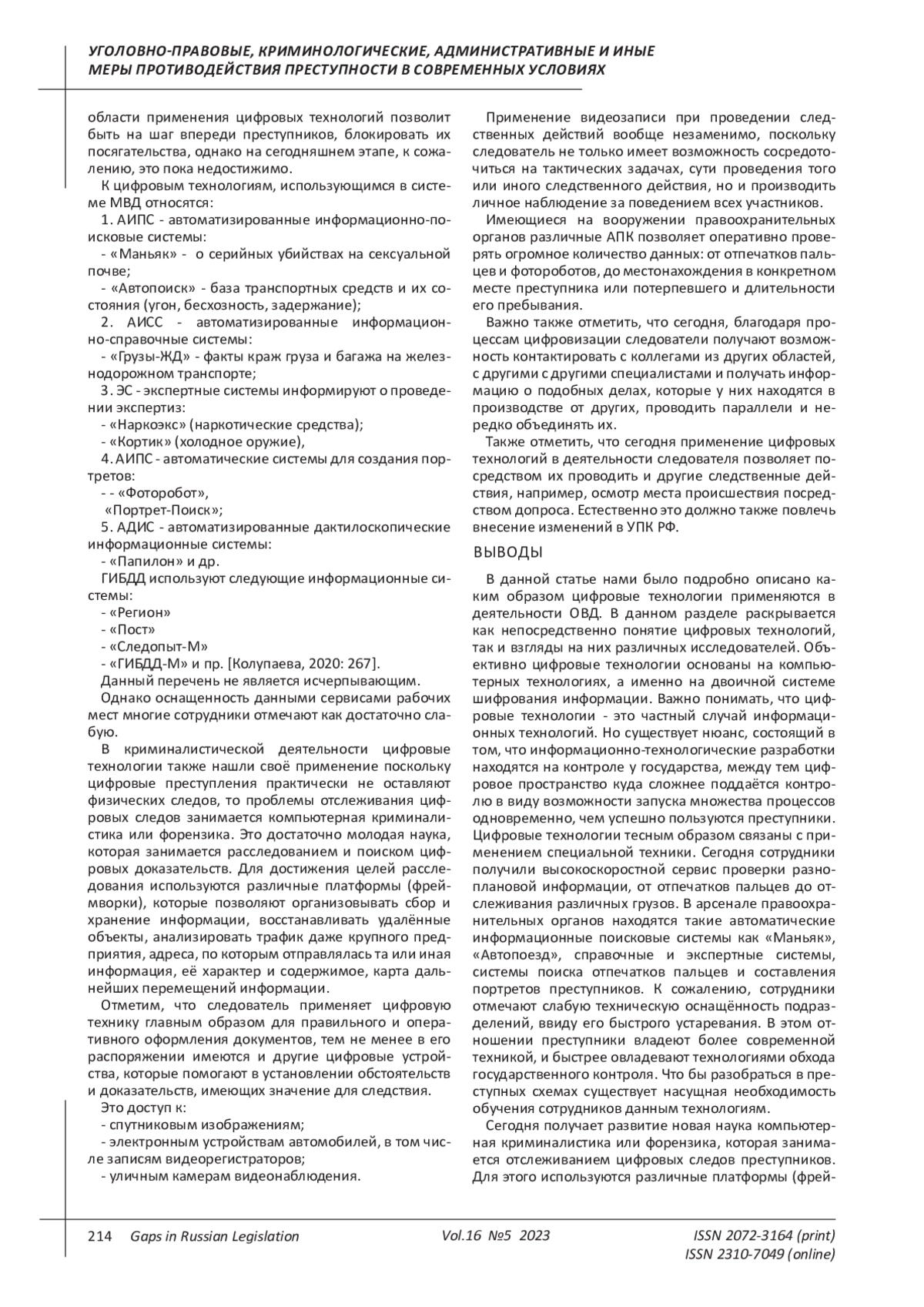 5. Колупаева Т.А. Использование информационных технологий в правоохранительной деятельности// Молодой ученый. - 2020. - № 22 (312). - С. 267-268. EDN: TNWNTE