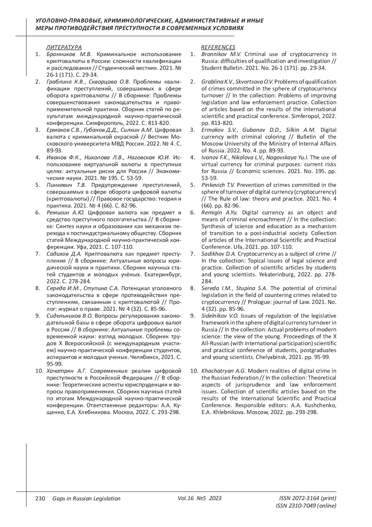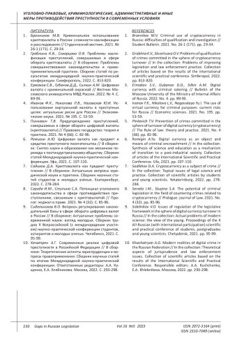 2. Граблина К.В., Скворцова О.В. Проблемы квалификации преступлений, совершаемых в сфере оборота криптовалюты // В сборнике: Проблемы совершенствования законодательства и правоприменительной практики. Сборник статей по результатам международной научно-практической конференции. Симферополь, 2022. С. 813-820. EDN: EXJOZX