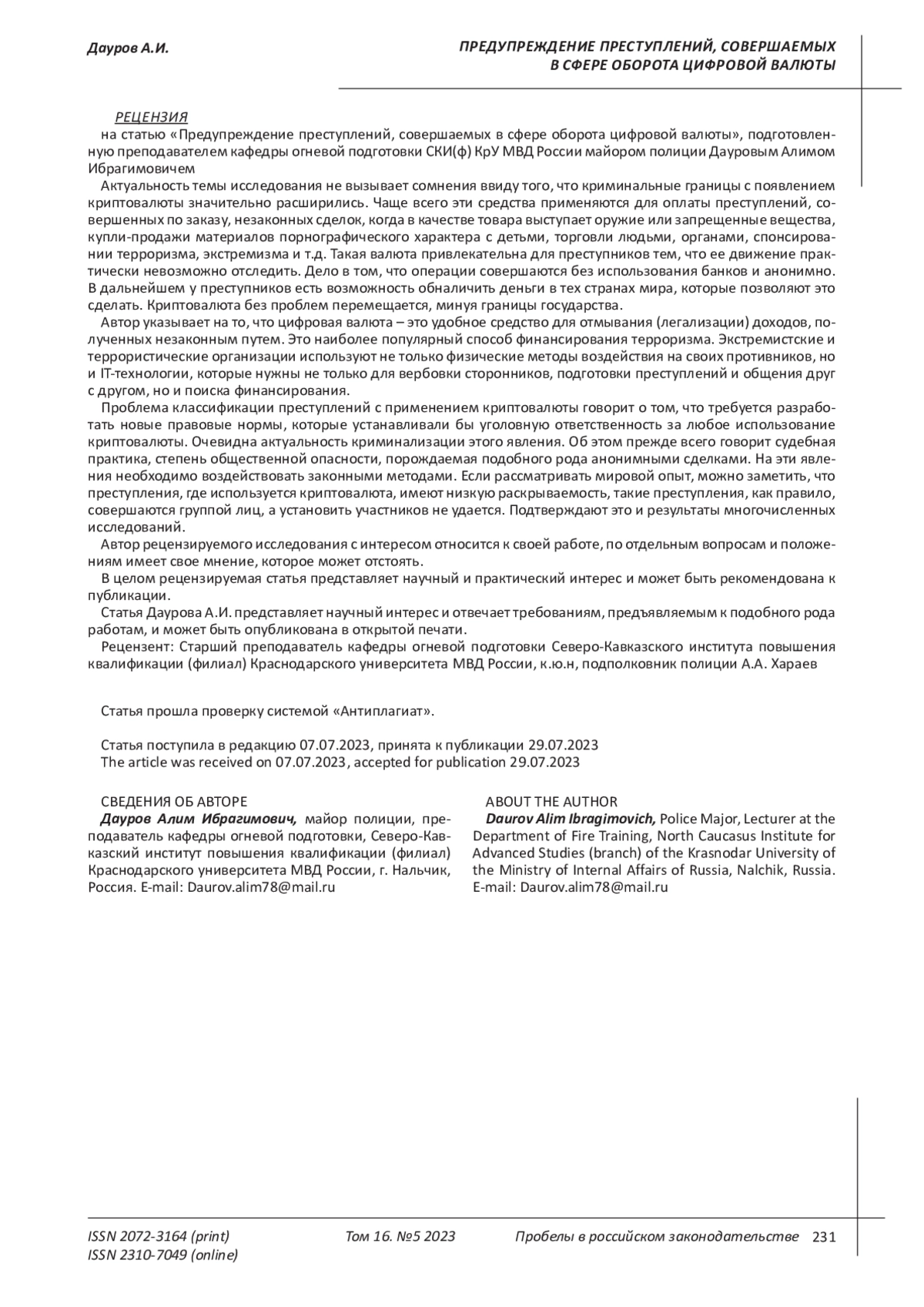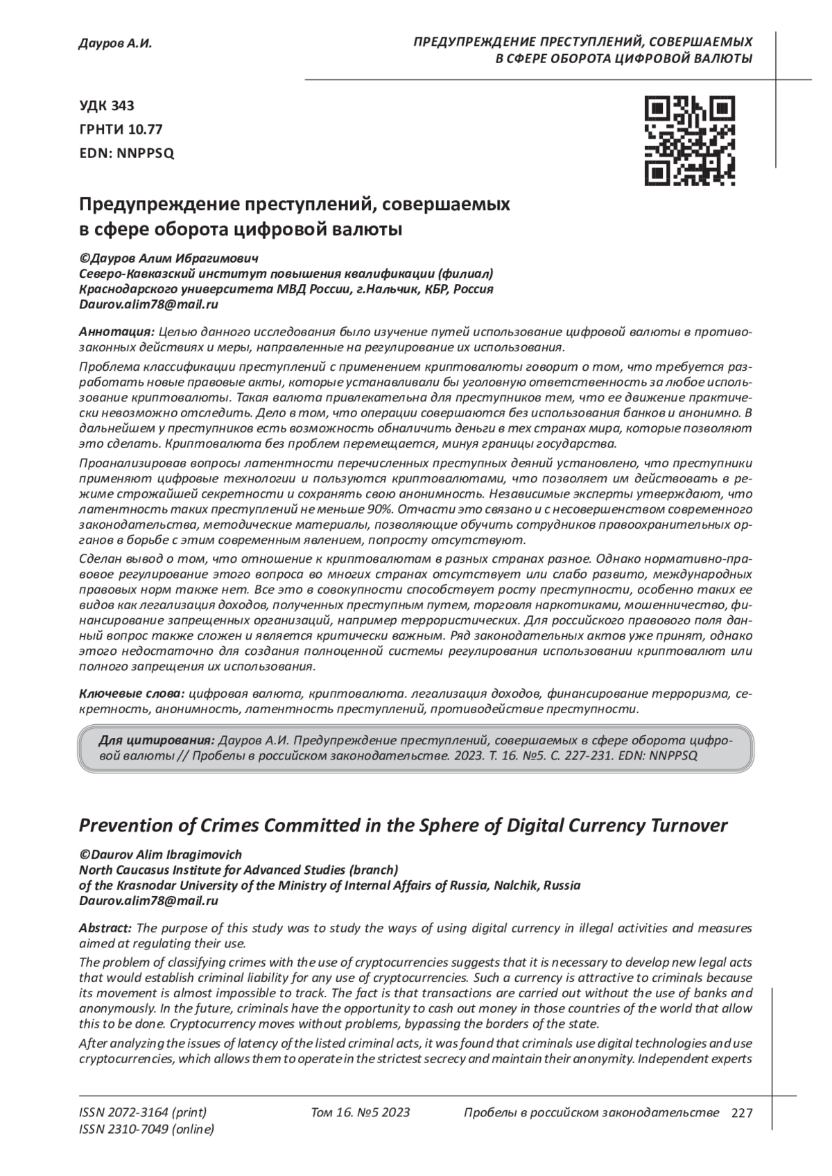 Pinkevich T.V. Prevention of crimes committed in the sphere of turnover of digital currency (cryptocurrency) // The Rule of law: theory and practice. 2021. No. 4 (66). pp. 82-96.