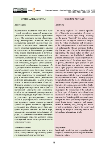 Исследование посвящено описанию культурной специфики языковой репрезентации власти в англосаксонском героическом эпосе. На материале поэмы «Беовульф» автор рассматривает эпическое наследие как источник сведений о ценностных ориентирах и предпочтениях правящей общности, способах и средствах выстраивания ее идентичности. Выделяются различные типы знаков идентификации и легитимации социального статуса правителей и их окружения, включая персональные интродуктивы, вокативы (эмблематические имена и обращения), локусные (места средоточия власти), атрибутивные (предметы, обладающие особой значимостью, ценности власти), соматические (телесные отличия, манера держаться и говорить, являющиеся частью идентичности социальной фигуры) и акциональные знаки (обозначения действий, связываемых с ролью субъекта власти в раннесредневековом обществе). Внимание уделяется модусам интродукции и интерпретации презентем власти (эмблематический, аллегорический, символический) в англосаксонской раннесредневековой лингвокультуре. Изучены особенности актуализации рассматриваемых типов знаков в социокультурных коммуникативных практиках (актах «демонстративной траты») во время публичных церемоний, собиравших всю общину вместе (дар, угощение медовым напитком во время пира, захоронение сокровищ в погребальных обрядах) и служивших способом самопредъявления власти обществу, создания образа властвующей элиты на внутреннем и межземельном уровне.