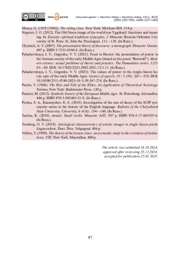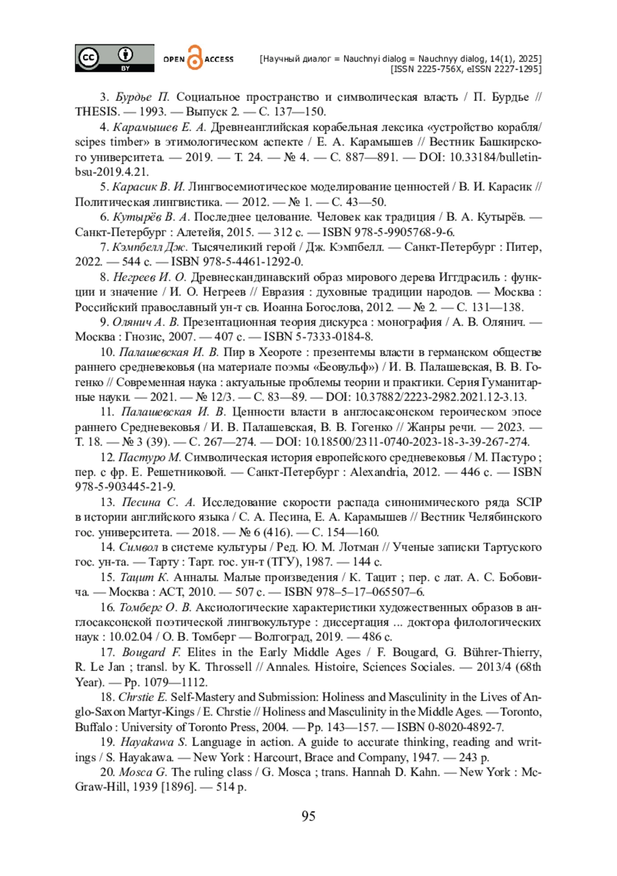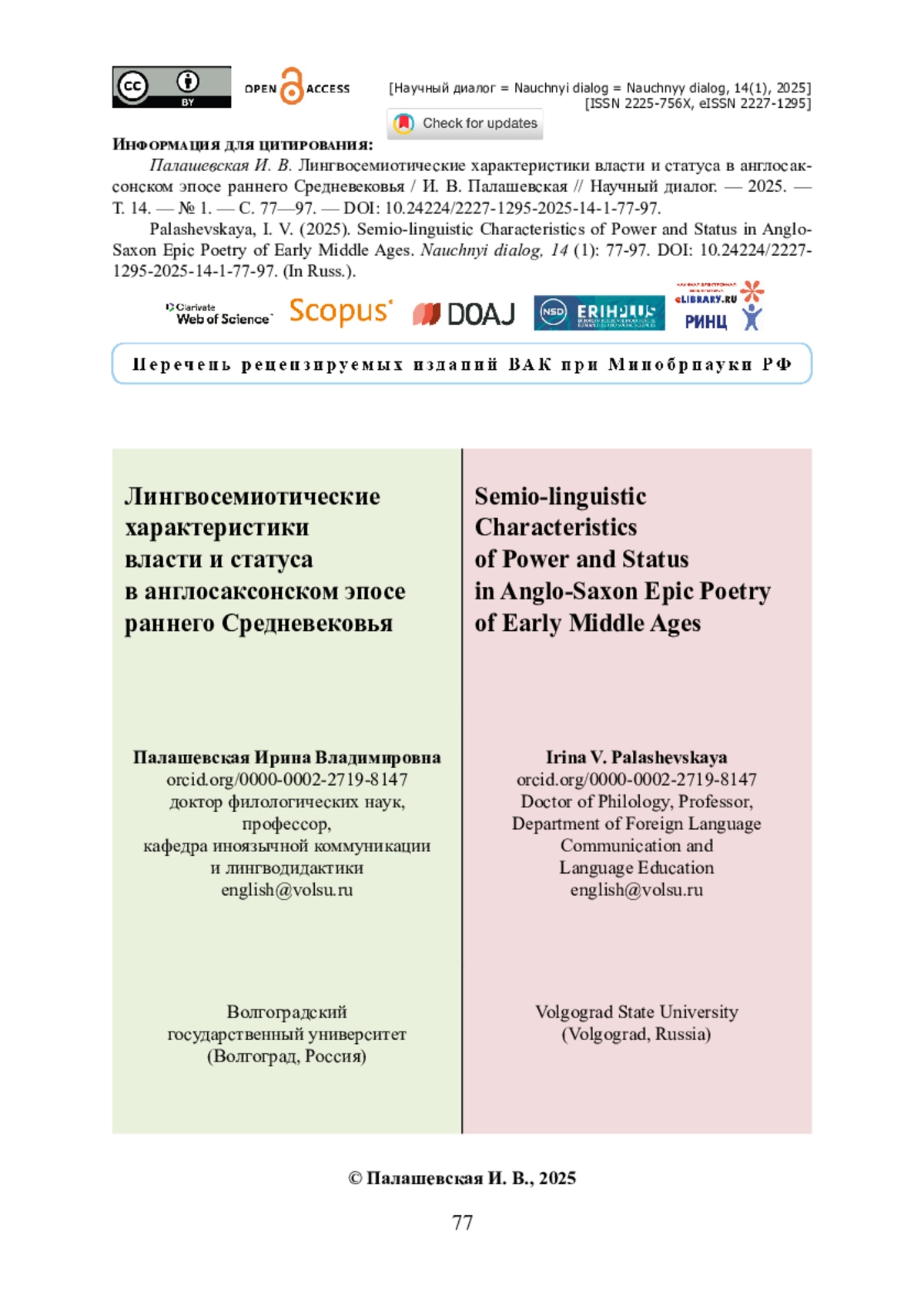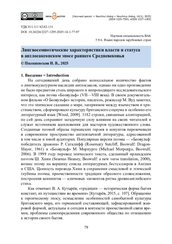 15. Палашевская И. В. Ценности власти в англосаксонском героическом эпосе раннего Средневековья / И. В. Палашевская, В. В. Гогенко // Жанры речи. - 2023. - Т. 18. - № 3 (39). - С. 267-274. - https://doi.org/10.18500/2311-0740-2023-18-3-39-267-274.