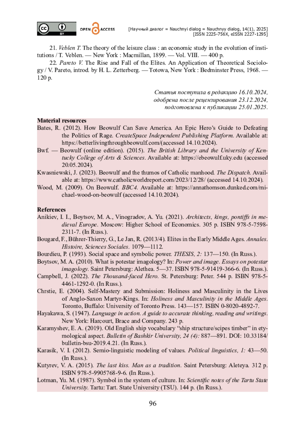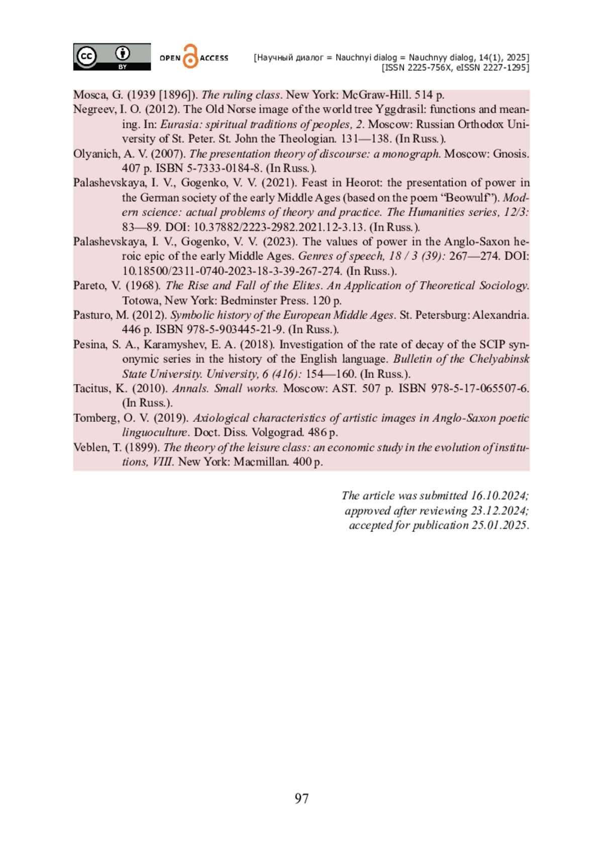 14. Палашевская И. В. Пир в Хеороте : презентемы власти в германском обществе раннего средневековья (на материале поэмы «Беовульф») / И. В. Палашевская, В. В. Гогенко // Современная наука : актуальные проблемы теории и практики. Серия Гуманитарные науки. - 2021. - № 12/3. - С. 83-89. - https://doi.org/10.37882/2223-2982.2021.12-3.13.