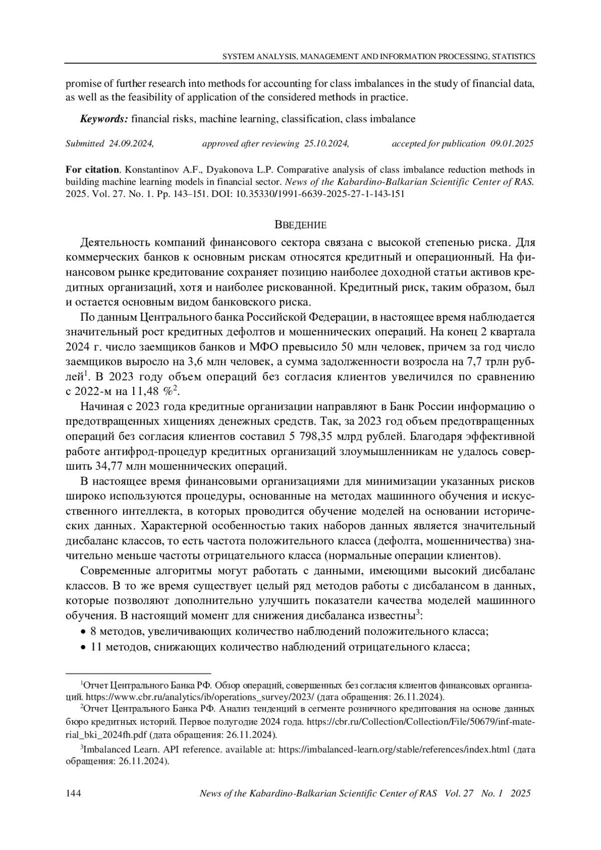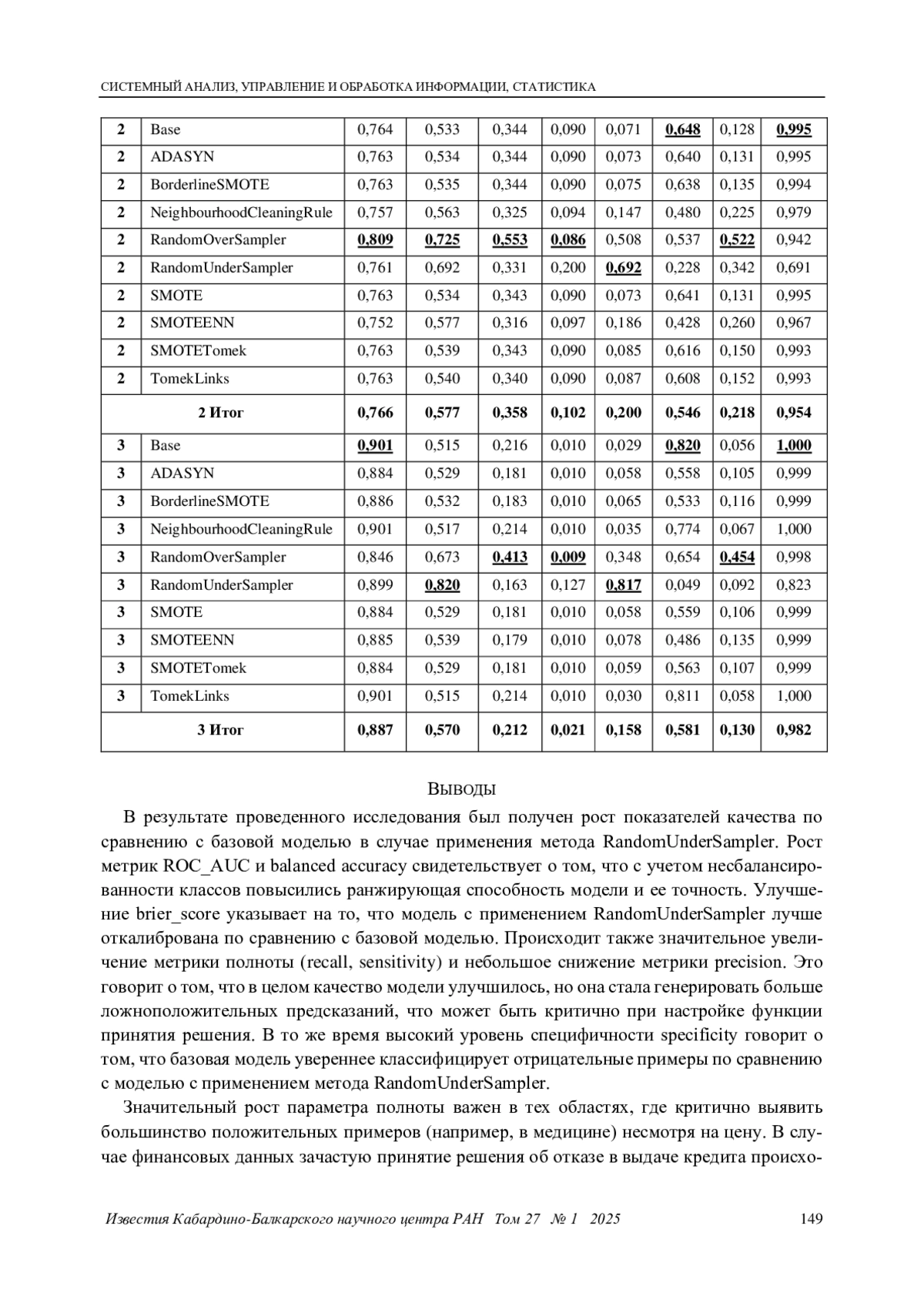 В статье рассматриваются методы улучшения показателей качества моделей машинного обучения, применяемых в финансовом секторе. В связи с тем, что наборы данных, на которых обучаются модели, обладают несбалансированностью классов, предлагается использовать модели, направленные на снижение дисбаланса. В исследовании были проведены эксперименты с применением 9 методов учета несбалансированности классов к трем наборам данных по розничному кредитованию. В качестве базовой использовалась модель градиентного бустинга CatboostClassifier, не учитывающая дисбаланс классов. Проведенные эксперименты показали, что применение метода RandomOverSampler дает существенный прирост показателей качества классификации по сравнению с базовой моделью. Результаты свидетельствуют о перспективности дальнейших исследований методов учета дисбаланса классов при изучении финансовых данных, а также о целесообразности применения рассмотренных методов на практике.