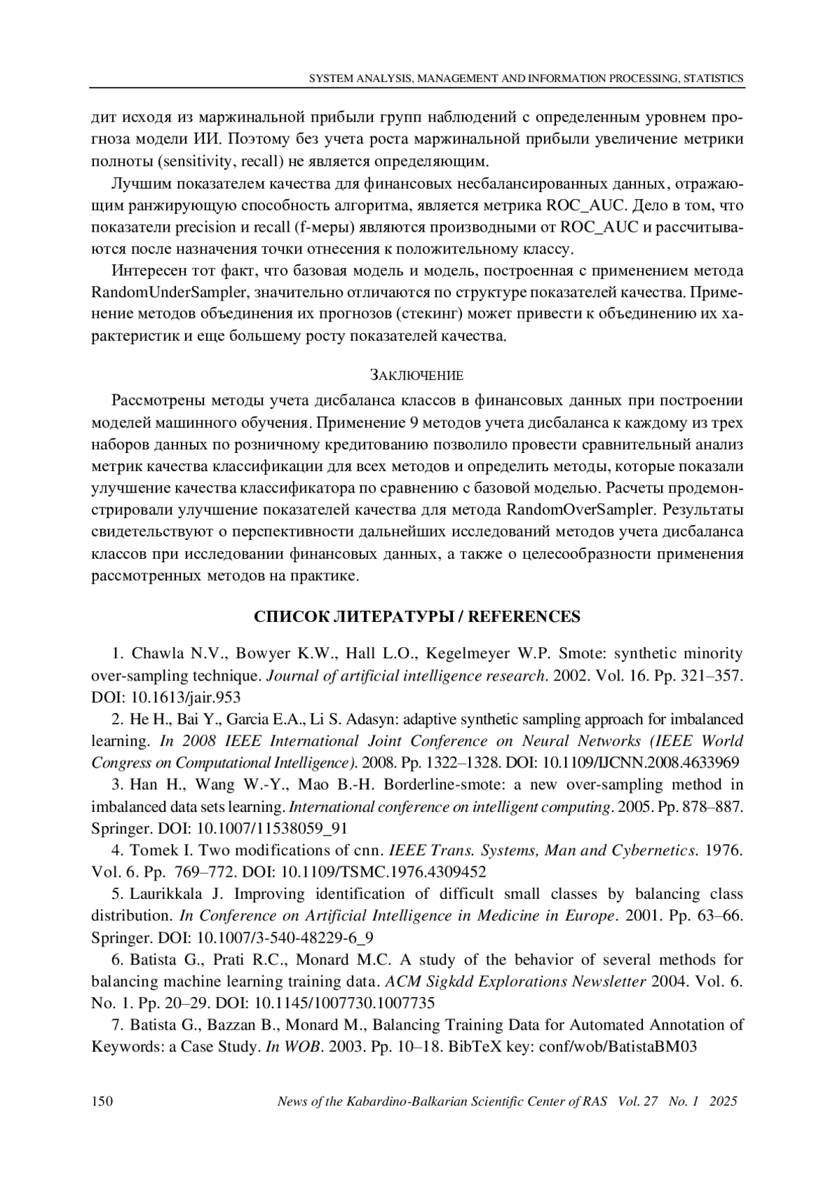 6. Batista G., Prati R.C., Monard M.C. A study of the behavior of several methods for balancing machine learning training data. ACM Sigkdd Explorations Newsletter 2004. Vol. 6. No. 1. Pp. 20-29. DOI: 10.1145/1007730.1007735