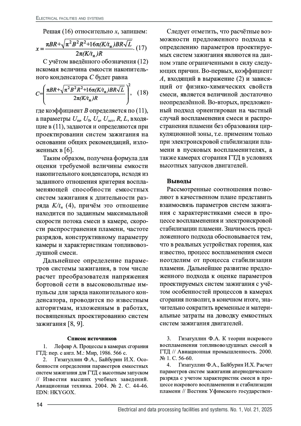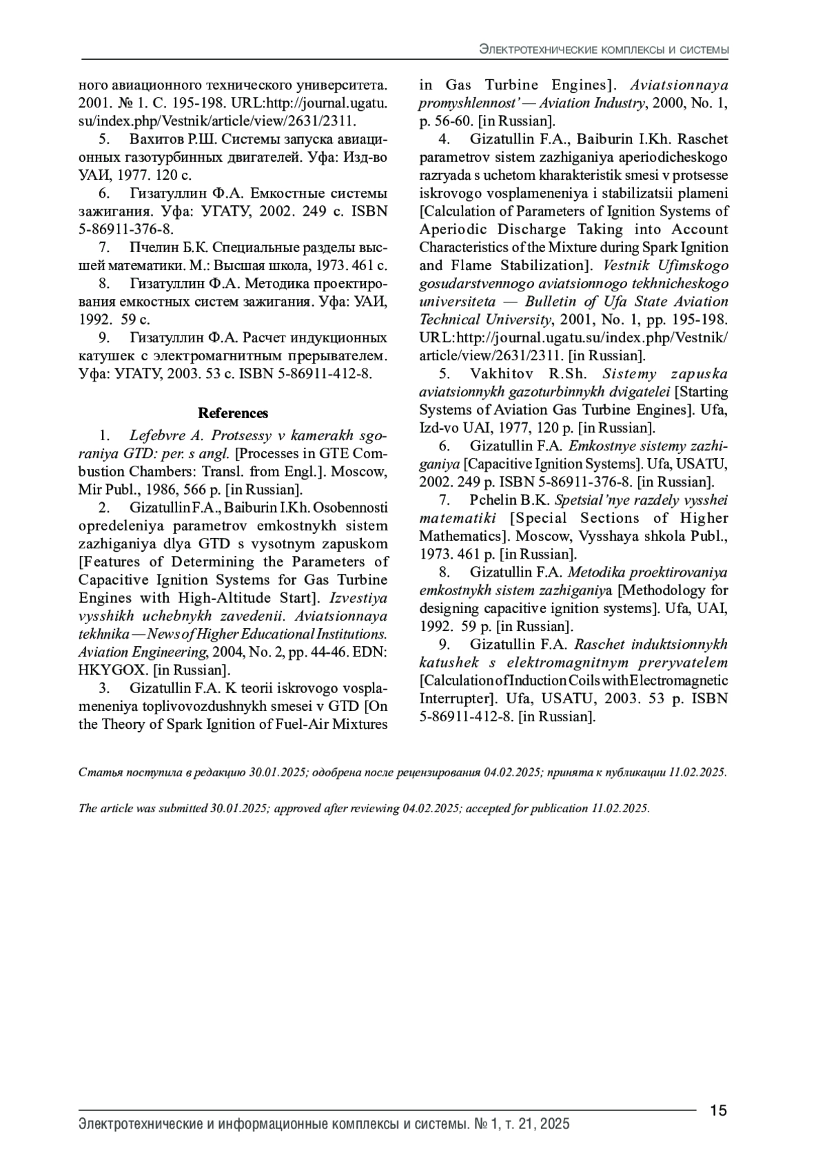 2. Гизатуллин Ф.А., Байбурин И.Х. Особенности определения параметров емкостных систем зажигания для ГТД с высотным запуском // Известия высших учебных заведений. Авиационная техника. 2004. № 2. С. 44-46. EDN: HKYGOX