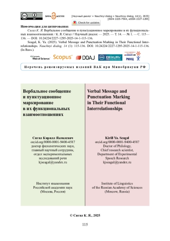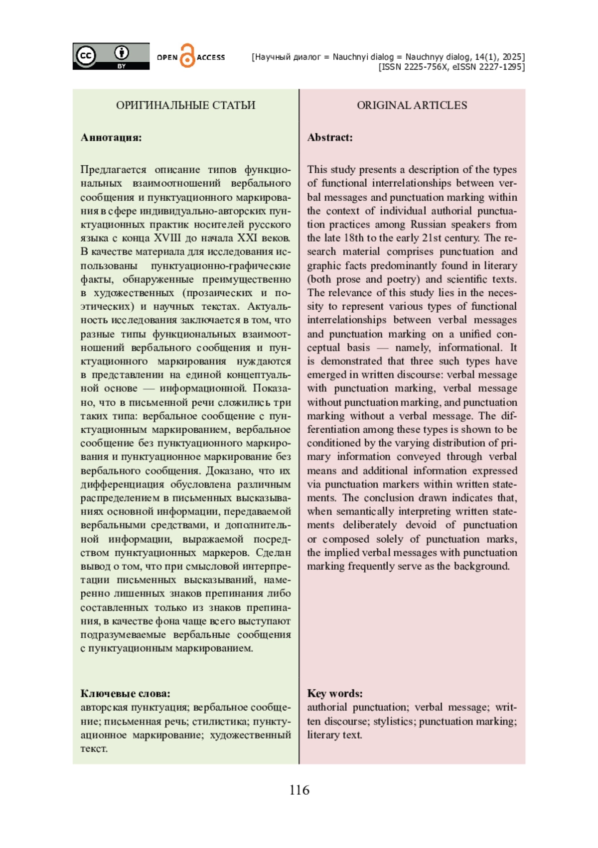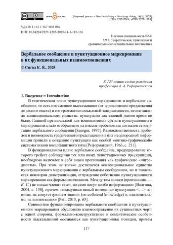 Предлагается описание типов функциональных взаимоотношений вербального сообщения и пунктуационного маркирования в сфере индивидуально-авторских пунктуационных практик носителей русского языка с конца XVIII до начала XXI веков. В качестве материала для исследования использованы пунктуационно-графические факты, обнаруженные преимущественно в художественных (прозаических и поэтических) и научных текстах. Актуальность исследования заключается в том, что разные типы функциональных взаимоотношений вербального сообщения и пунктуационного маркирования нуждаются в представлении на единой концептуальной основе — информационной. Показано, что в письменной речи сложились три таких типа: вербальное сообщение с пунктуационным маркированием, вербальное сообщение без пунктуационного маркирования и пунктуационное маркирование без вербального сообщения. Доказано, что их дифференциация обусловлена различным распределением в письменных высказываниях основной информации, передаваемой вербальными средствами, и дополнительной информации, выражаемой посредством пунктуационных маркеров. Сделан вывод о том, что при смысловой интерпретации письменных высказываний, намеренно лишенных знаков препинания либо составленных только из знаков препинания, в качестве фона чаще всего выступают подразумеваемые вербальные сообщения с пунктуационным маркированием.