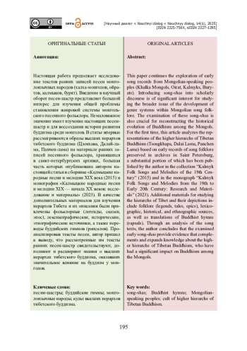 Настоящая работа продолжает исследование текстов ранних записей песен монголоязычных народов (халха-монголов, ойратов, калмыков, бурят). Введение в научный оборот песен-шастр представляет большой интерес для изучения общей проблемы становления жанровой системы монгольского песенного фольклора. Немаловажное значение имеет изучение настоящих песен-шастр и для воссоздания истории развития буддизма среди монголов. В статье впервые рассматриваются образы высших иерархов тибетского буддизма (Цзонхава, Далай-лама, Панчен-лама) на материале ранних записей песенного фольклора, хранящихся в санкт-петербургских архивах, большая часть которых опубликована автором настоящей статьи в сборнике «Калмыцкие народные песни и мелодии XIX века (2015) и монографии «Калмыцкие народные песни и мелодии XIX — начала XX веков: исследование и материалы» (2023). В качестве дополнительных материалов для изучения иерархов Тибета и их описания были привлечены фольклорные (легенды, сказки, эпос), лексикографические, исторические, этнографические источники, а также переводы буддийских гимнов (рапсалов). Проанализировав тексты песен, автор пришел к выводу, что рассмотренные им тексты ранних песен-шастр свидетельствуют, дополняют и расширяют знания о высших иерархах тибетского буддизма, оказавших значительное влияние на буддизм у монголов.