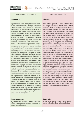 Предложена новая интерпретация «большого стихотворения» Иосифа Бродского «Тритон» (1994, первоначальное название «Моллюск») и его титульных образов. Сообщается, что ранее исследователи трактовали заглавный образ исключительно метафорически, в опоре на поэтическую образность стиха, аллюзийно связывая образы моллюска и тритона с символикой морской стихии или более предметно — даже с историко-архитектурным контекстом стихотворения. В статье выбран иной подход: предложено связать историю создания текста с реальными событиями жизни Бродского, в частности с сердечным приступом, инфарктом, который он пережил накануне. Показано, что образ моллюска имеет у Бродского вполне конкретный источник метафоризации — человеческое сердце, подобно живому моллюску открывающее и закрывающее свои створки, наполняющее камеры, связанное с жизненно важной аортой. Прослежено, как возникающие, кажется, случайные «медицинские» детали обрастают дополнительными коннотациями, обеспечивая семантико-смысловую поддержку всего поэтического целого. Предложены варианты причин и истоков изменения названия стихотворения, трансформации его титульного образа. Показано, что «таинственность» заглавного образа стихотворения Бродского имеет не только бытийную, но и бытовую природу. Авторы отмечают, что контекст советской литературы, в которой формировался поэт, не мог помешать ему создать глубокое философское произведение.