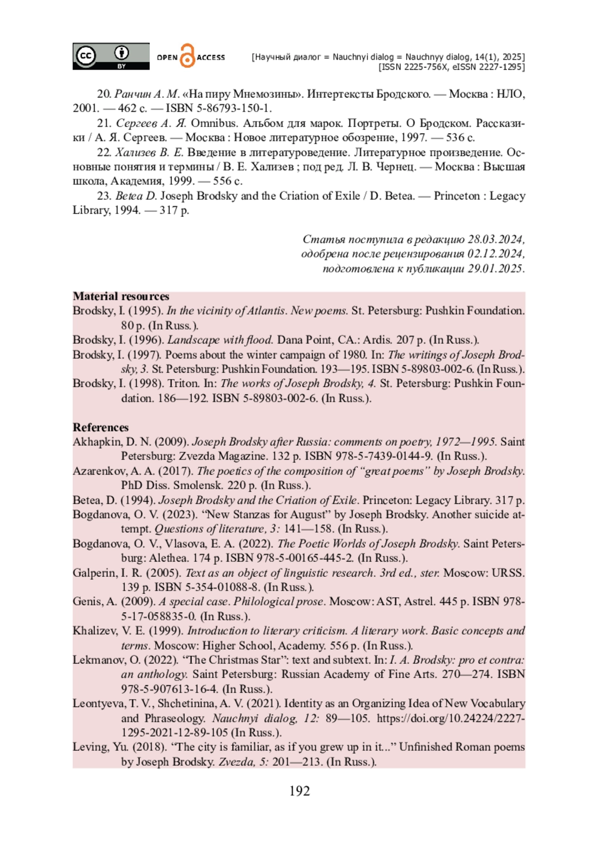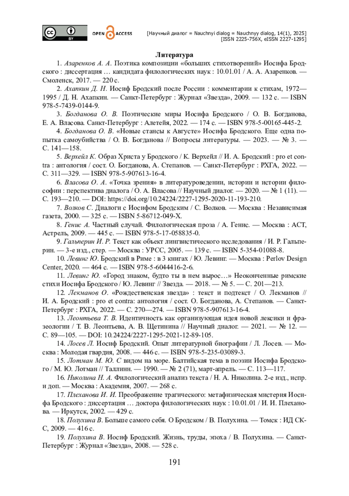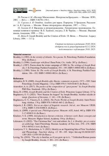 7. Богданова О. В. Поэтические миры Иосифа Бродского / О. В. Богданова, Е. А. Власова. Санкт-Петербург : Алетейя, 2022. - 174 с. - ISBN 978-5-00165-445-2.