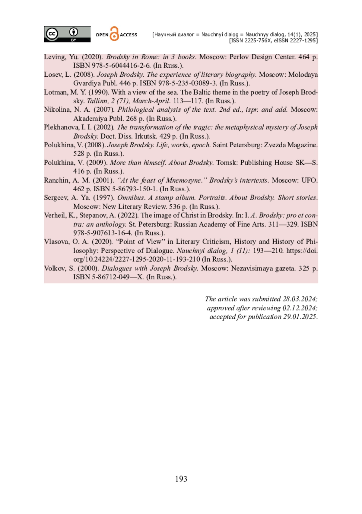 24. Ранчин А. М. «На пиру Мнемозины». Интертексты Бродского. - Москва : НЛО, 2001. - 462 с. - ISBN 5-86793-150-1.