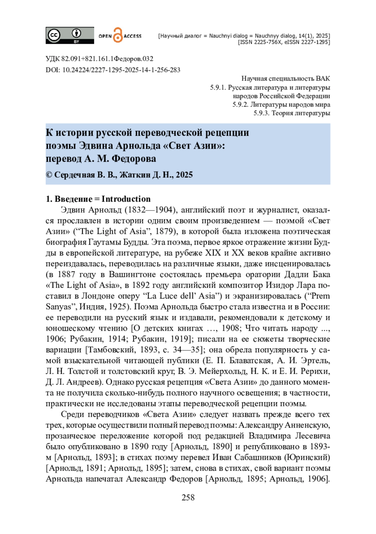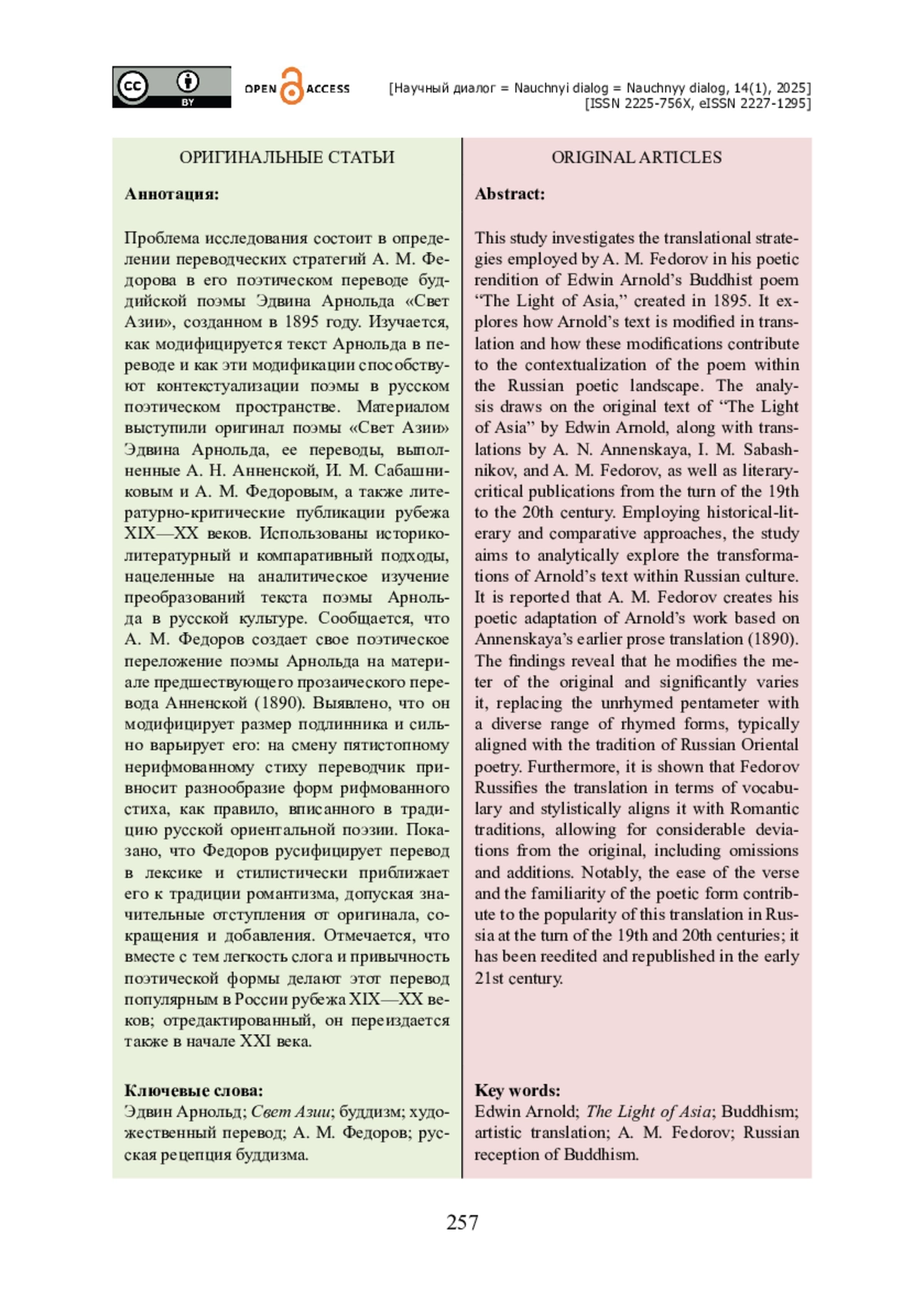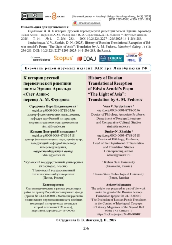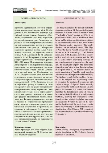 Проблема исследования состоит в определении переводческих стратегий А. М. Федорова в его поэтическом переводе буддийской поэмы Эдвина Арнольда «Свет Азии», созданном в 1895 году. Изучается, как модифицируется текст Арнольда в переводе и как эти модификации способствуют контекстуализации поэмы в русском поэтическом пространстве. Материалом выступили оригинал поэмы «Свет Азии» Эдвина Арнольда, ее переводы, выполненные А. Н. Анненской, И. М. Сабашниковым и А. М. Федоровым, а также литературно-критические публикации рубежа XIX-XX веков. Использованы историко-литературный и компаративный подходы, нацеленные на аналитическое изучение преобразований текста поэмы Арнольда в русской культуре. Сообщается, что А. М. Федоров создает свое поэтическое переложение поэмы Арнольда на материале предшествующего прозаического перевода Анненской (1890). Выявлено, что он модифицирует размер подлинника и сильно варьирует его: на смену пятистопному нерифмованному стиху переводчик привносит разнообразие форм рифмованного стиха, как правило, вписанного в традицию русской ориентальной поэзии. Показано, что Федоров русифицирует перевод в лексике и стилистически приближает его к традиции романтизма, допуская значительные отступления от оригинала, сокращения и добавления. Отмечается, что вместе с тем легкость слога и привычность поэтической формы делают этот перевод популярным в России рубежа XIX-XX веков; отредактированный, он переиздается также в начале XXI века.