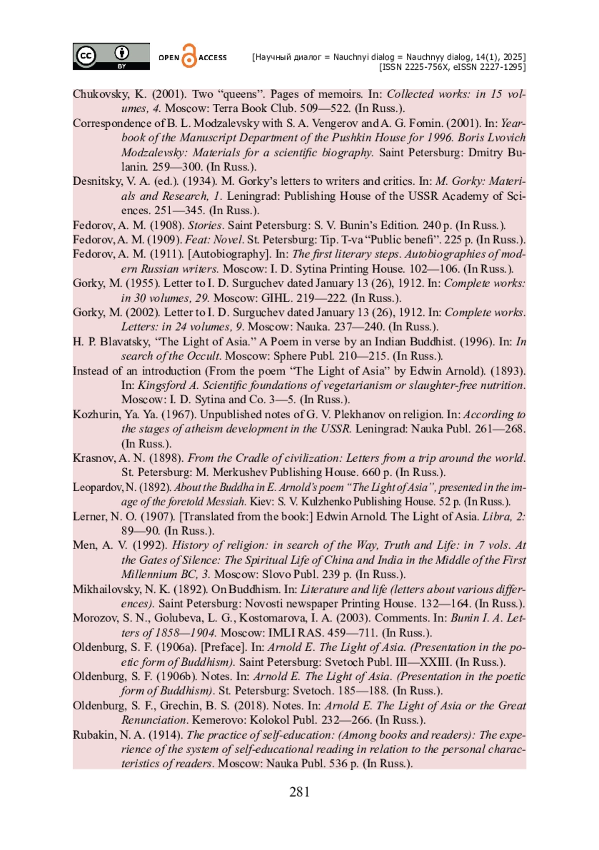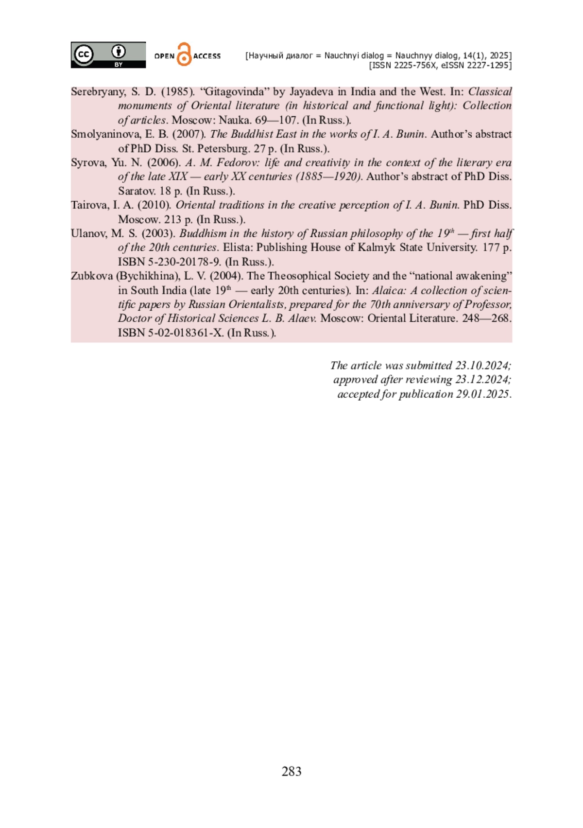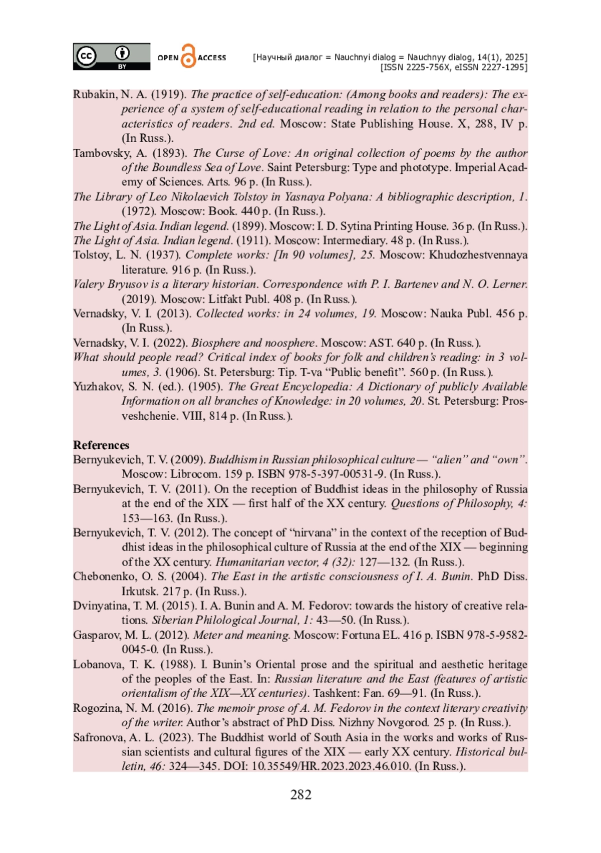 59. Сафронова А. Л. Буддийский мир Южной Азии в трудах и творчестве российских ученых и деятелей культуры XIX - начала XX в. / А. Л. Сафронова // Исторический вестник. - 2023. - Т. 46. - С. 324-345. - https://doi.org/10.35549/HR.2023.2023.46.010.