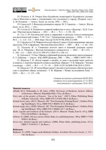 10. Бакаева Э. П. Почитание Большой Медведицы в среде ойратов и калмыков: древнейшие представления и буддийские напластования / Э. П. Бакаева // Oriental Studies. - 2020. - Т. 13. - № 3. - С. 661-687. - https://doi.org/10.22162/2619-0990-2020-49-3-661-687.