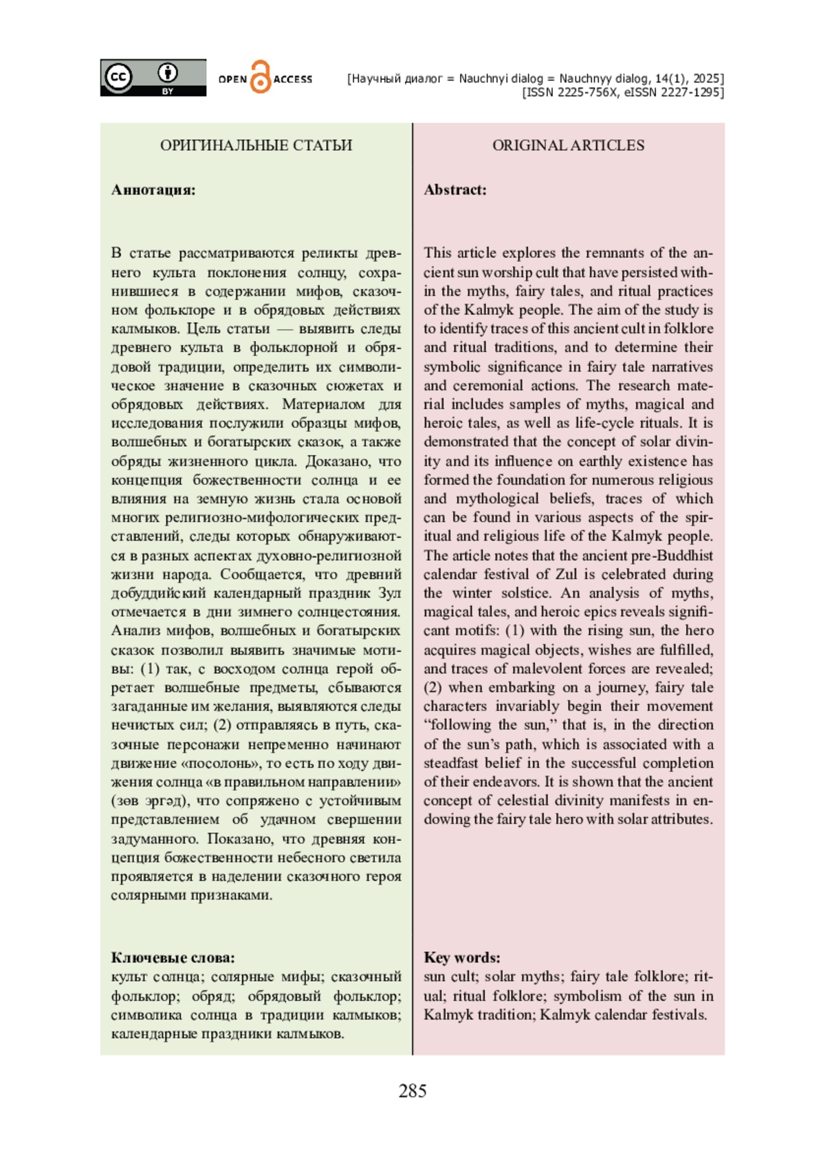 В статье рассматриваются реликты древнего культа поклонения солнцу, сохранившиеся в содержании мифов, сказочном фольклоре и в обрядовых действиях калмыков. Цель статьи — выявить следы древнего культа в фольклорной и обрядовой традиции, определить их символическое значение в сказочных сюжетах и обрядовых действиях. Материалом для исследования послужили образцы мифов, волшебных и богатырских сказок, а также обряды жизненного цикла. Доказано, что концепция божественности солнца и ее влияния на земную жизнь стала основой многих религиозно-мифологических представлений, следы которых обнаруживаются в разных аспектах духовно-религиозной жизни народа. Сообщается, что древний добуддийский календарный праздник Зул отмечается в дни зимнего солнцестояния. Анализ мифов, волшебных и богатырских сказок позволил выявить значимые мотивы: (1) так, с восходом солнца герой обретает волшебные предметы, сбываются загаданные им желания, выявляются следы нечистых сил; (2) отправляясь в путь, сказочные персонажи непременно начинают движение «посолонь», то есть по ходу движения солнца «в правильном направлении» (зөв эргәд), что сопряжено с устойчивым представлением об удачном свершении задуманного. Показано, что древняя концепция божественности небесного светила проявляется в наделении сказочного героя солярными признаками.