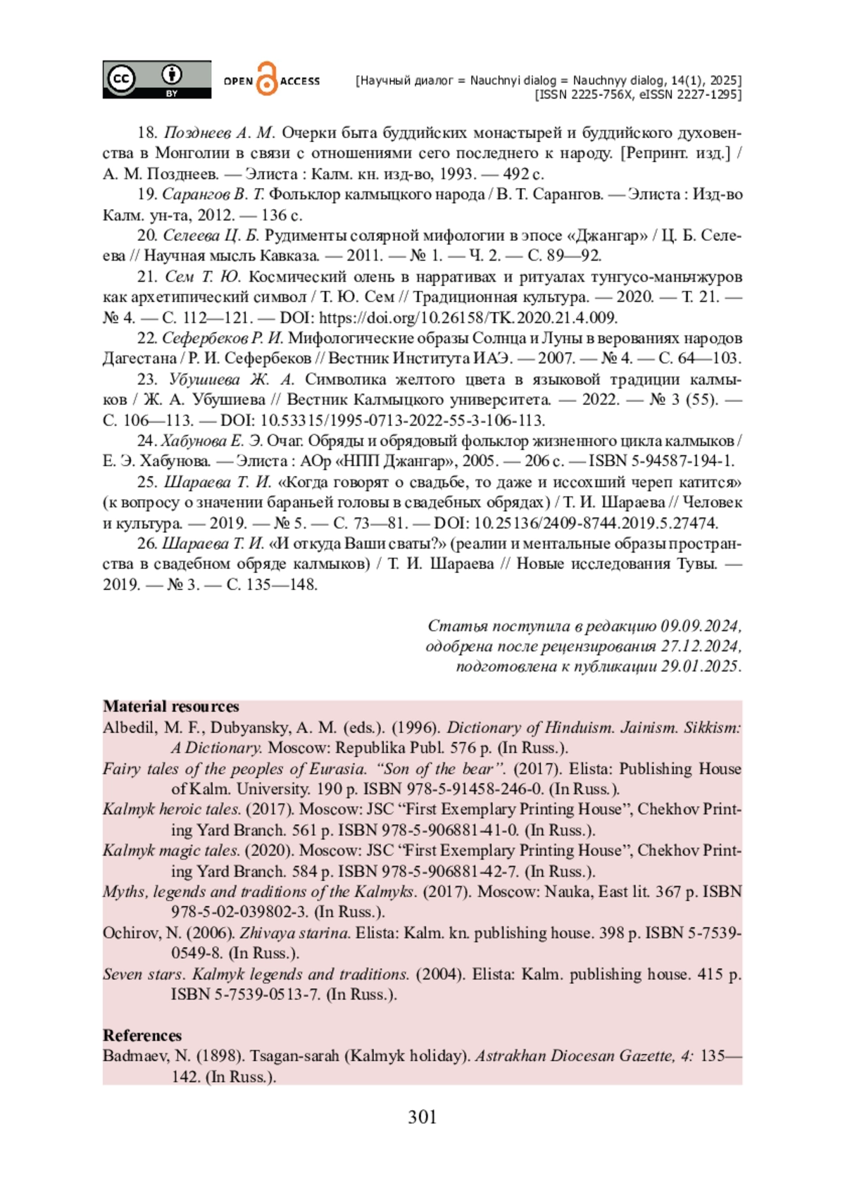 14. Болдырева В. В. К вопросу об ориентации жилища у калмыков / В. В. Болдырева, А. Б. Лиджиев // Вестник Института комплексных исследований аридных территорий. - 2019. - № 1 (38). - С. 127-129.