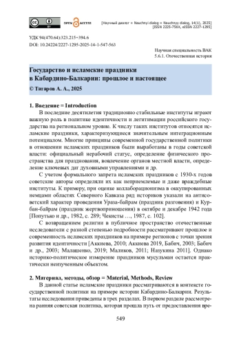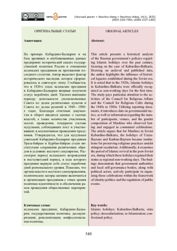 На примере Кабардино-Балкарии и на базе архивных и опубликованных данных предпринят исторический анализ государственной политики России в отношении исламских праздников на протяжении последнего столетия. Автор выделяет фактор исторического наследия, которое сформировалось в советскую эпоху. Сообщается, что в 1920-х годах исламские праздники в Кабардино-Балкарии впервые получили статус нерабочих дней. Уделено внимание периоду деятельности уполномоченных Совета по делам религиозных культов и Совета по делам религий в 1940-1980-х годах. Благодаря отчетным документам в оборот вводятся данные о тактике властей, а также количестве участников, местах проведения, гендерном составе мусульман, соблюдавших пост и участвовавших в коллективном проведении праздников. Утверждается, что для мусульман советской Кабардино-Балкарии праздники Ураза-байрам и Курбан-байрам стали институтами сохранения религиозных обрядов в условиях жесткого секуляризма. Рассмотрен период исламского возрождения в постсоветский период, в ходе которого праздники вернули себе статус нерабочих дней регионального уровня. Показано, что органы власти и местного самоуправления, политические акторы активно включаются в организацию праздников с точки зрения политики идентичности и обеспечения рамок проведения общественных мероприятий.