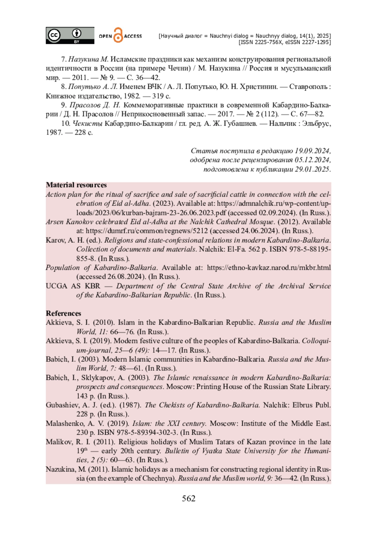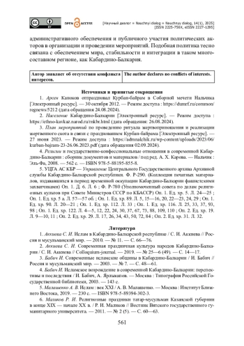 7. Аккиева С. И. Современная праздничная культура народов Кабардино-Балкарии / С. И. Аккиева // Colloquium-journal. - 2019. - № 25-6 (49). - С. 14-17.