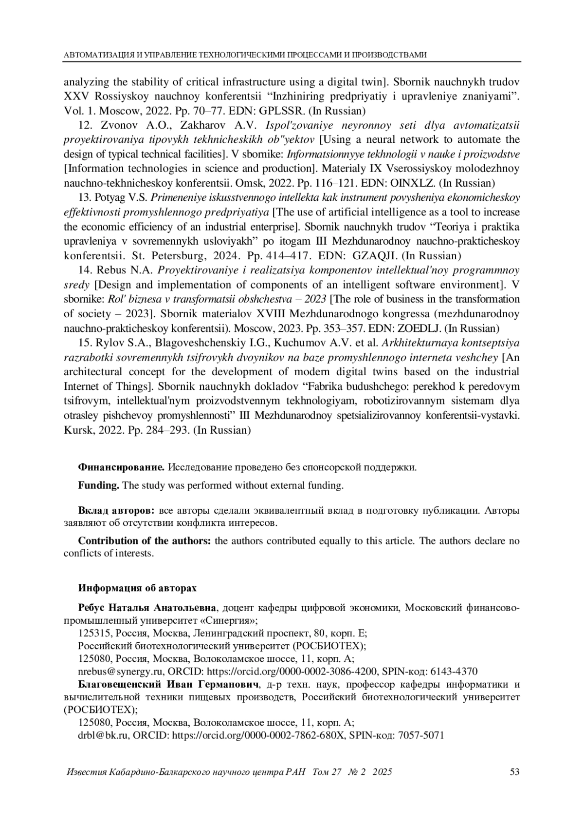 15. Рылов С. А., Благовещенский И. Г., Кучумов А. В. и др. Архитектурная концепция разработки современных цифровых двойников на базе промышленного интернета вещей. Сборник научных докладов “Фабрика будущего: переход к передовым цифровым, интеллектуальным производственным технологиям, роботизированным системам для отраслей пищевой промышленности” III Международной специализированной конференции-выставки. Курск, 2022. С. 284-293. EDN: MWBCMJ