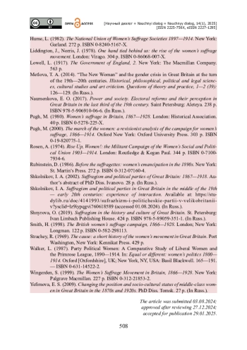 30. Hume L. The National Union of Women’s Suffrage Societies 1897-1914 / L. Hume. - New York : Garland, 1982. - 272 p. - ISBN 0-8240-5167-X.