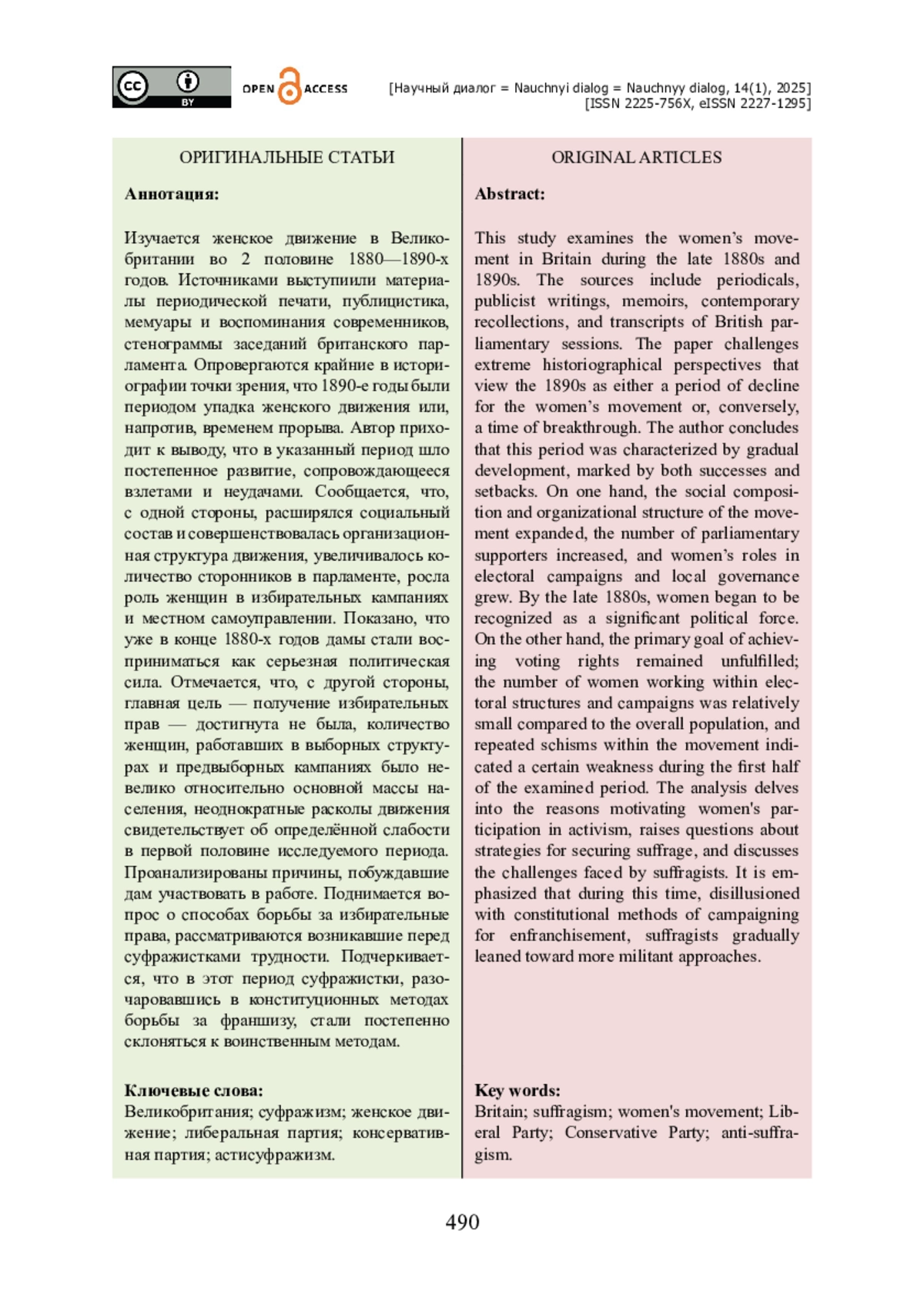 Изучается женское движение в Великобритании во 2 половине 1880—1890-х годов. Источниками выступили материалы периодической печати, публицистика, мемуары и воспоминания современников, стенограммы заседаний британского парламента. Опровергаются крайние в историографии точки зрения, что 1890-е годы были периодом упадка женского движения или, напротив, временем прорыва. Автор приходит к выводу, что в указанный период шло постепенное развитие, сопровождающееся взлетами и неудачами. Сообщается, что, с одной стороны, расширялся социальный состав и совершенствовалась организационная структура движения, увеличивалось количество сторонников в парламенте, росла роль женщин в избирательных кампаниях и местном самоуправлении. Показано, что уже в конце 1880-х годов дамы стали восприниматься как серьезная политическая сила. Отмечается, что, с другой стороны, главная цель — получение избирательных прав — достигнута не была, количество женщин, работавших в выборных структурах и предвыборных кампаниях было невелико относительно основной массы населения, неоднократные расколы движения свидетельствует об определённой слабости в первой половине исследуемого периода. Проанализированы причины, побуждавшие дам участвовать в работе. Поднимается вопрос о способах борьбы за избирательные права, рассматриваются возникавшие перед суфражистками трудности. Подчеркивается, что в этот период суфражистки, разочаровавшись в конституционных методах борьбы за франшизу, стали постепенно склоняться к воинственным методам.