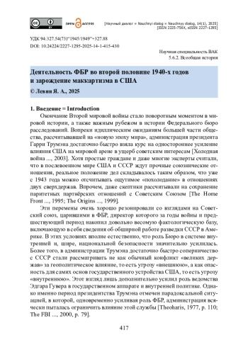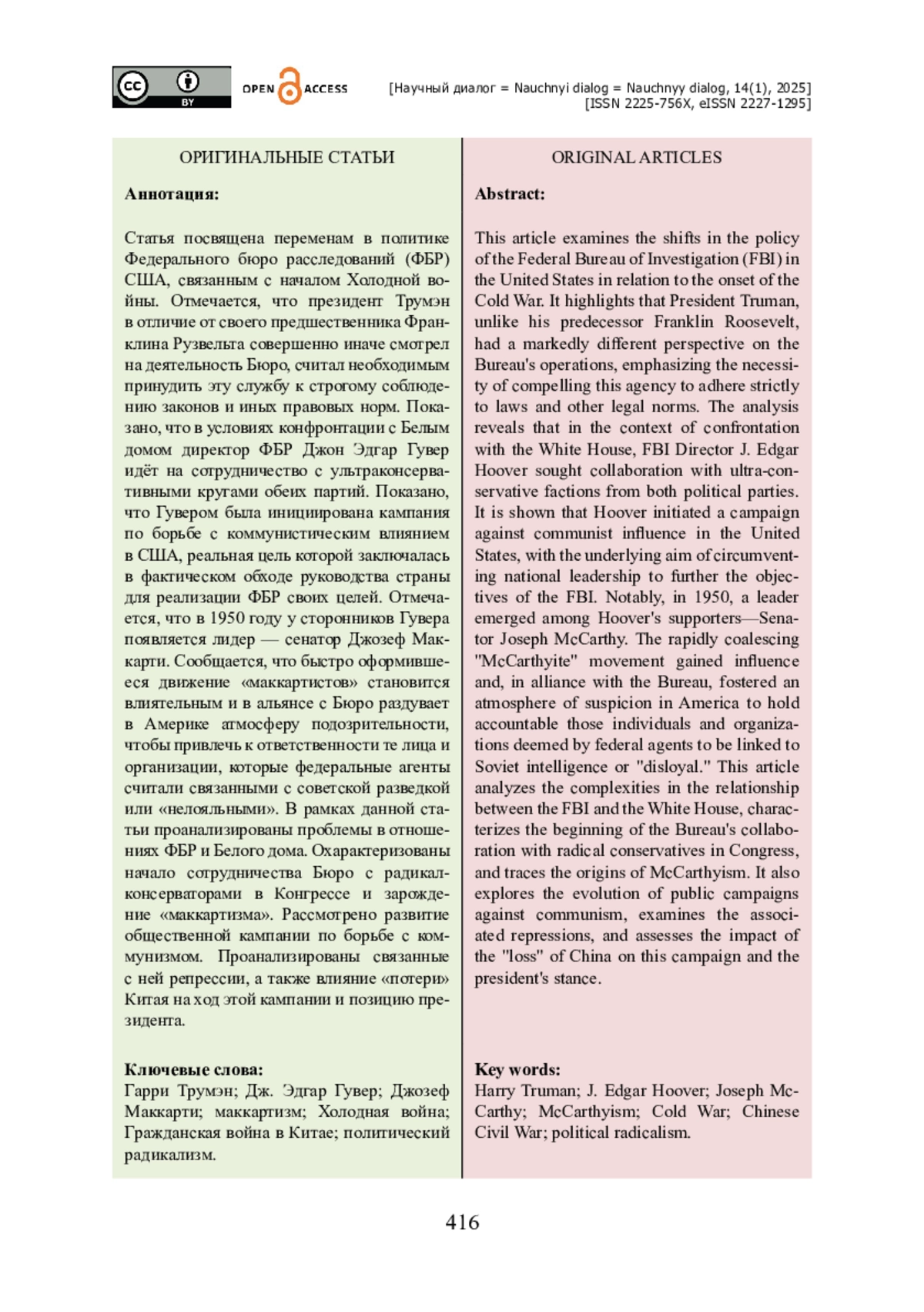 Статья посвящена переменам в политике Федерального бюро расследований (ФБР) США, связанным с началом Холодной войны. Отмечается, что президент Трумэн в отличие от своего предшественника Франклина Рузвельта совершенно иначе смотрел на деятельность Бюро, считал необходимым принудить эту службу к строгому соблюдению законов и иных правовых норм. Показано, что в условиях конфронтации с Белым домом директор ФБР Джон Эдгар Гувер идёт на сотрудничество с ультраконсервативными кругами обеих партий. Показано, что Гувером была инициирована кампания по борьбе с коммунистическим влиянием в США, реальная цель которой заключалась в фактическом обходе руководства страны для реализации ФБР своих целей. Отмечается, что в 1950 году у сторонников Гувера появляется лидер — сенатор Джозеф Маккарти. Сообщается, что быстро оформившееся движение «маккартистов» становится влиятельным и в альянсе с Бюро раздувает в Америке атмосферу подозрительности, чтобы привлечь к ответственности те лица и организации, которые федеральные агенты считали связанными с советской разведкой или «нелояльными». В рамках данной статьи проанализированы проблемы в отношениях ФБР и Белого дома. Охарактеризованы начало сотрудничества Бюро с радикал-консерваторами в Конгрессе и зарождение «маккартизма». Рассмотрено развитие общественной кампании по борьбе с коммунизмом. Проанализированы связанные с ней репрессии, а также влияние «потери» Китая на ход этой кампании и позицию президента.