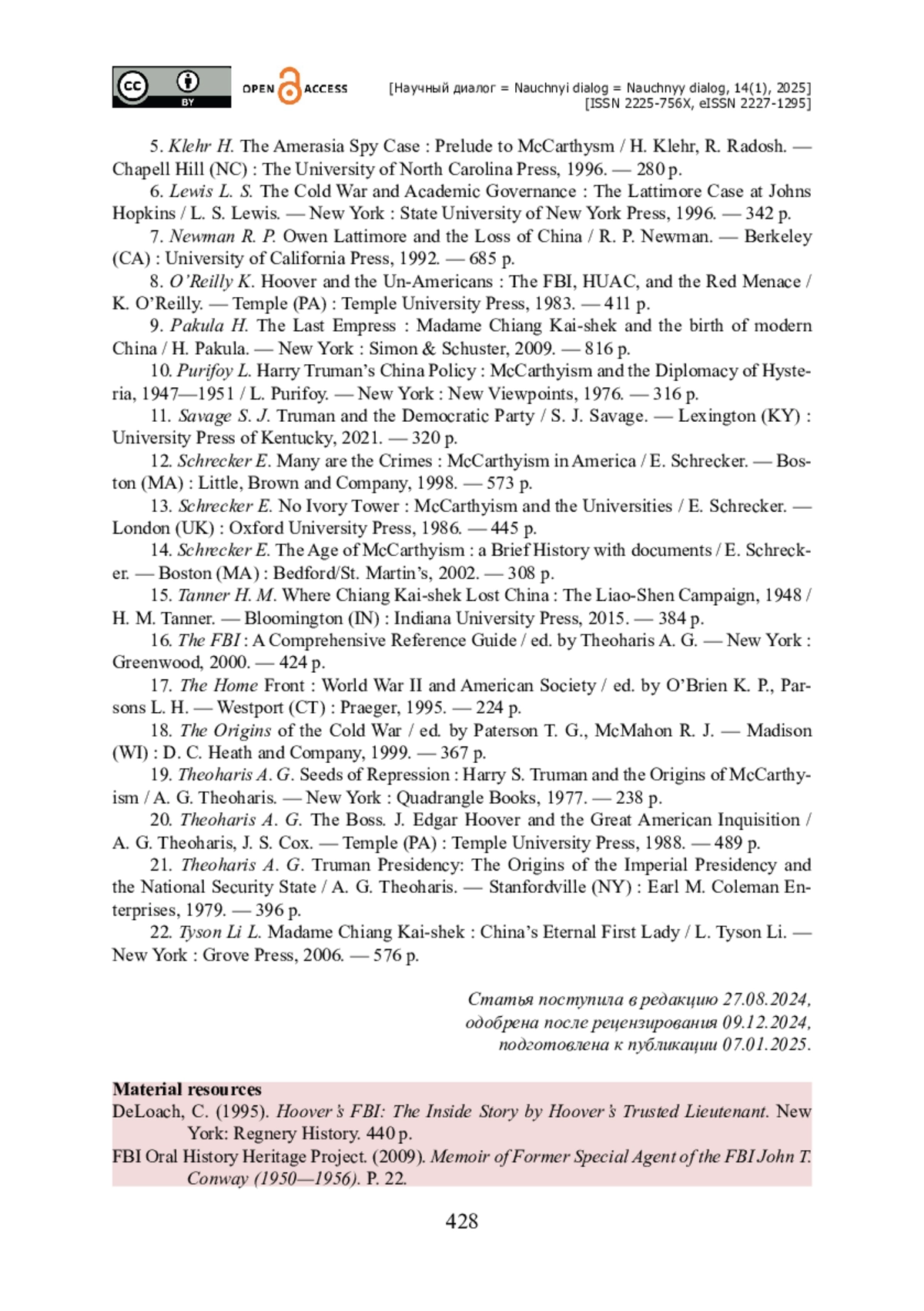 19. Klehr H. The Amerasia Spy Case : Prelude to McCarthysm / H. Klehr, R. Radosh. - Chapell Hill (NC) : The University of North Carolina Press, 1996. - 280 р.