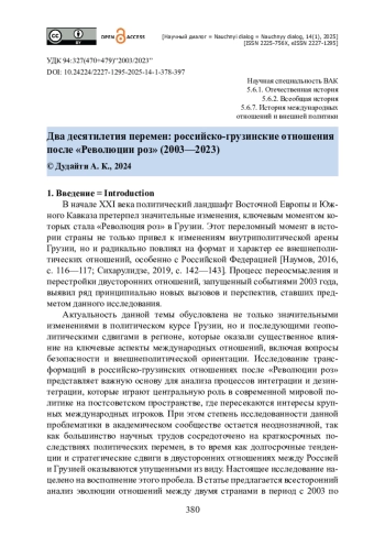 Статья посвящена анализу изменений в отношениях между Россией и Грузией, произошедших после «Революции роз». В рамках проведенного исследования автор ставит задачу оценить основные этапы и ключевые аспекты трансформации двусторонних отношений, которые оказали значительное влияние на региональную политическую динамику. В качестве материалов привлекаются официальные документы, публикации в СМИ, аналитические отчеты, что позволяет обеспечить комплексный подход к анализу данных. Применены методы политического анализа, исторический обзор, сопоставительный анализ данных, что способствует всестороннему пониманию изучаемой проблематики. Исследование демонстрирует, что революция привела к ухудшению отношений, особенно после введения визовых и торговых ограничений. В последующие годы наблюдалась флуктуация отношений с периодами обострения. Особенно важным является снижение напряженности и возобновление диалога в последние годы. Исследование выявило основные факторы, влияющие на динамику отношений, включая внешнеполитические ориентации Грузии и региональные конфликты. В работе подчеркивается, что политическая воля и международное посредничество оказывают ключевое влияние на процесс восстановления доверия между странами, что ставит перед ними новые вызовы и возможности для урегулирования противоречий.
