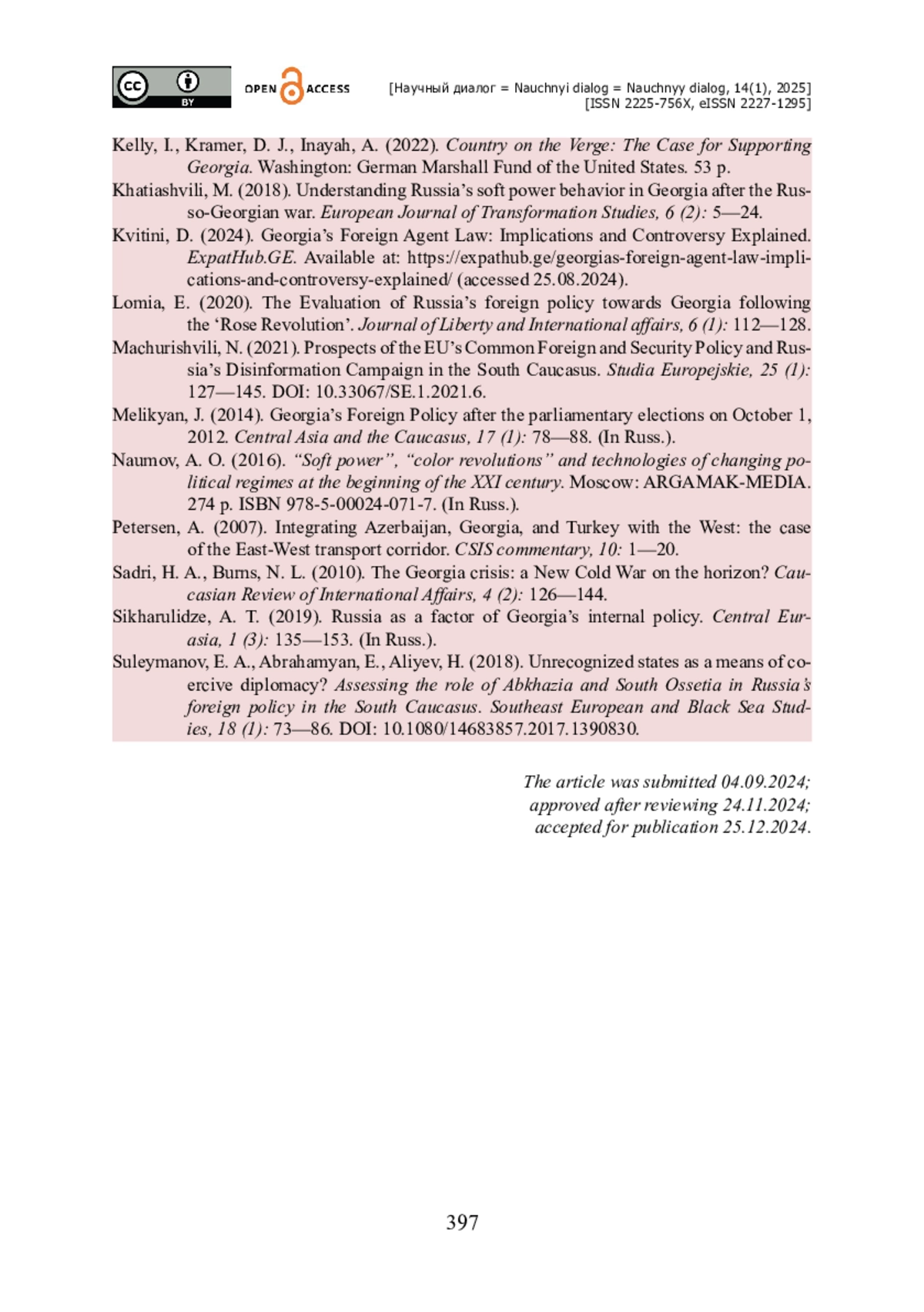 36. Khatiashvili M. Understanding Russia’s soft power behavior in Georgia after the Russo-Georgian war / M. Khatiashvili // European Journal of Transformation Studies. - 2018. - Vol. 6. - № 2. - Pp. 5-24.