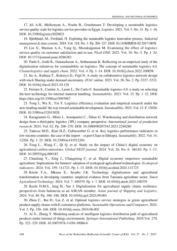 17. Ali A.H., Melkonyan A., Noche B., Gruchmann T. Developing a sustainable logistics service quality scale for logistics service providers in Egypt. Logistics. 2021. Vol. 5. No. 21. Pp. 1-16. DOI: 10.3390/logistics5020021 EDN: NDLDJU